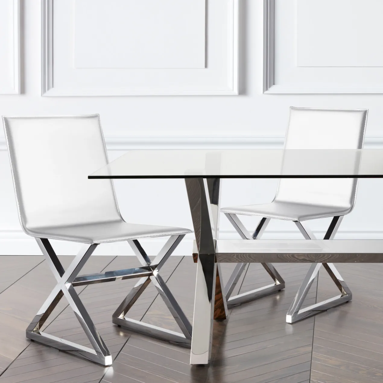 Our Axis collection conveys a contemporary design through its lustrous finishes. The Axis dining chair features a polished stainless steel base and durable bonded leather upholstery. Shown in White.