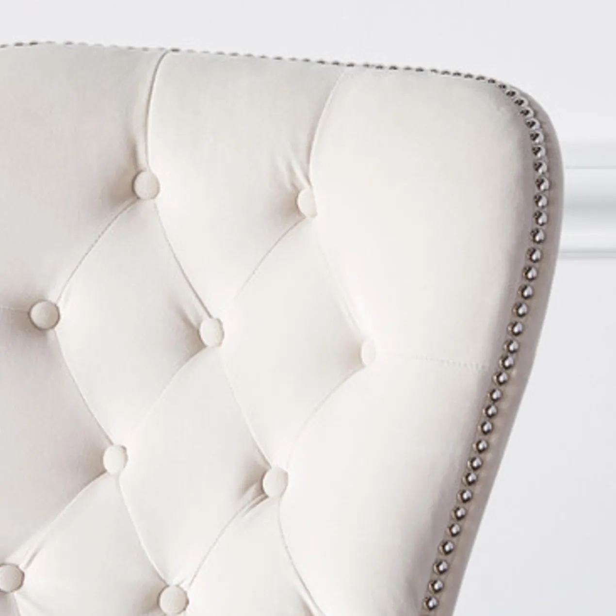 With its gentle curving silhouette, our sophisticated Charlotte Dining Chair effortlessly elevates the style of any room. Plush upholstery and hand-applied nail head details atop wooden legs make our Charlotte Dining Chair both refined and versatile. A pull ring matching the nailheads adorns the back of each chair. Shown in Bella Velvet Pearl with bright nickel nailheads.