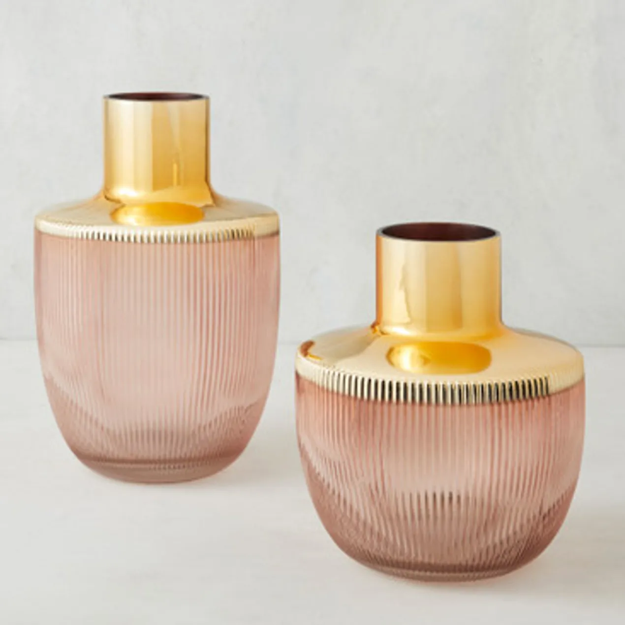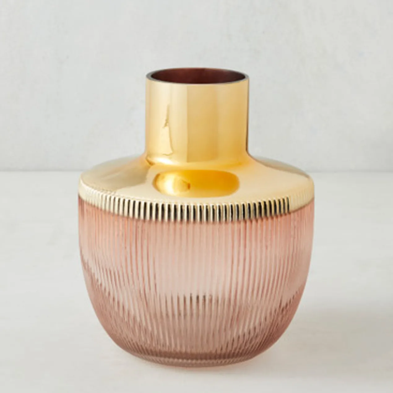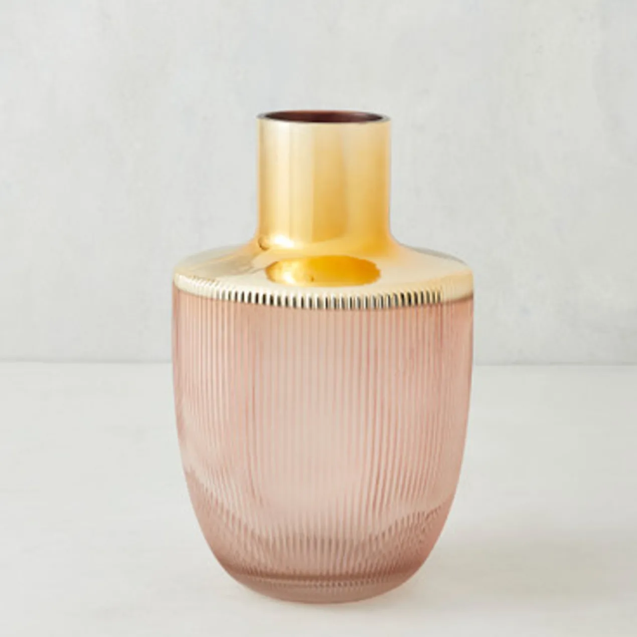 A gorgeous accent even when it’s not holding fresh blooms, this vase is crafted of blush-hued glass with a ribbed texture and gleaming gold top.