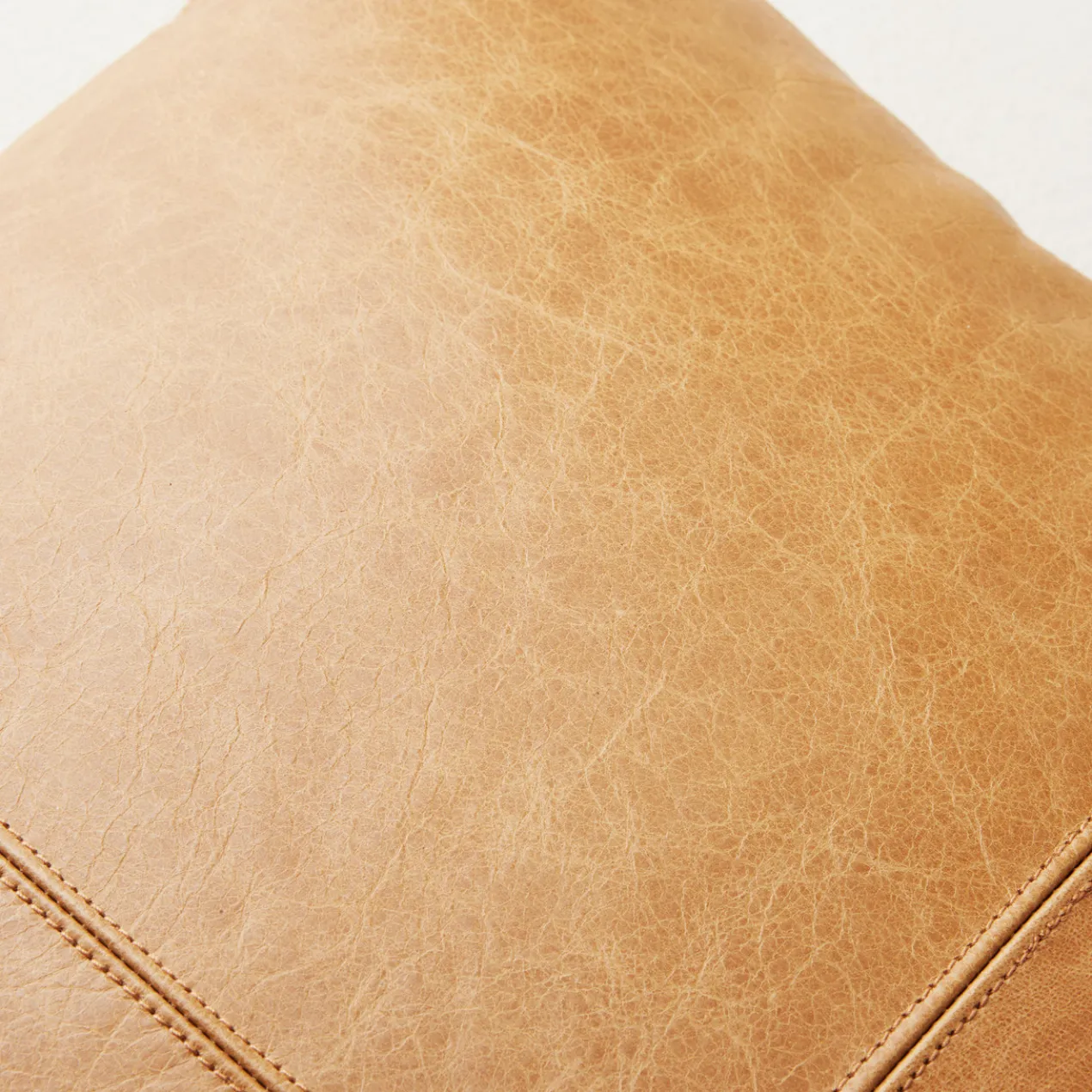 A sleek and stylish accent for the sofa, this pillow is crafted of supple leather with double-stitched panels, self-welt trim, and a solid cotton back. A feather-and-down insert ensures long-lasting comfort.