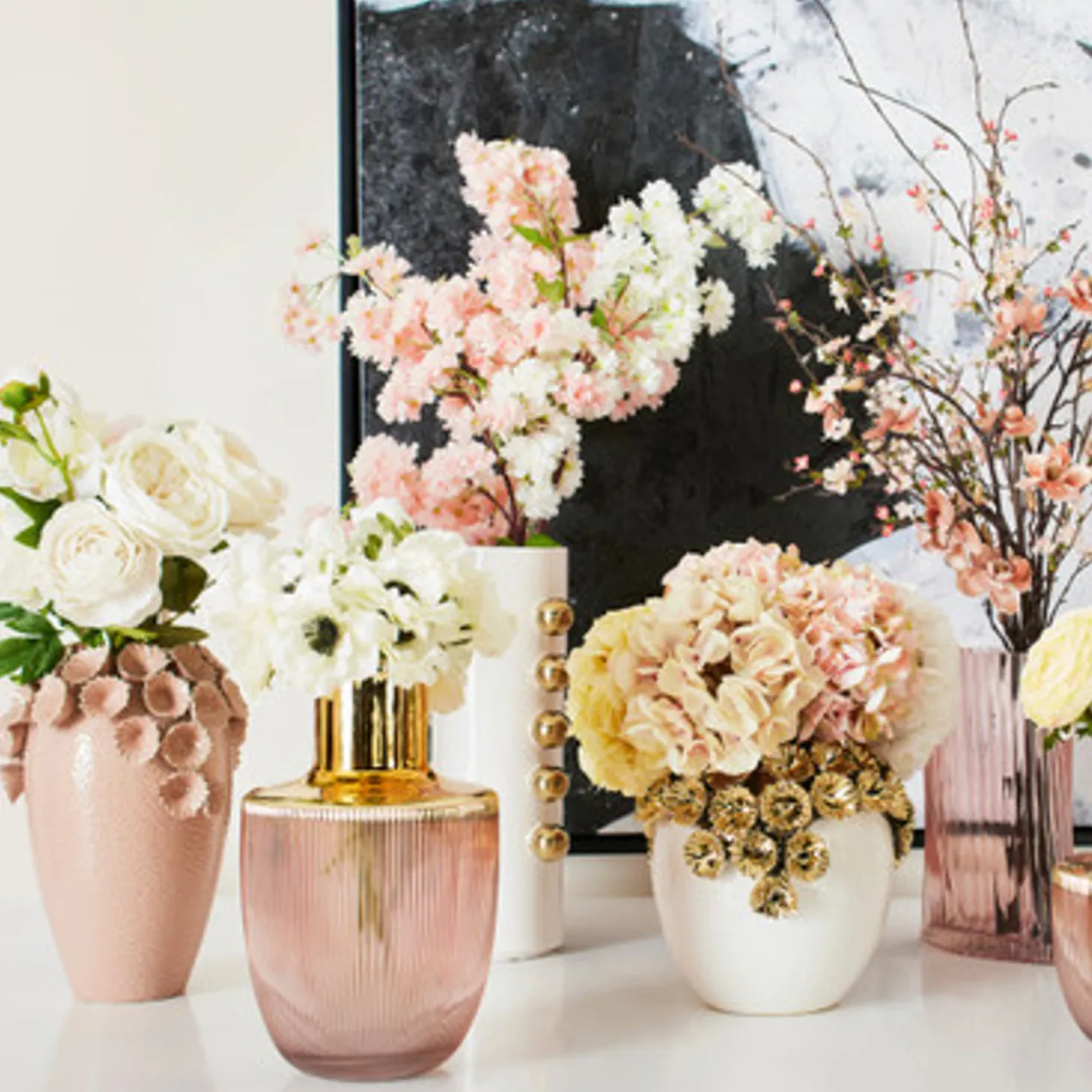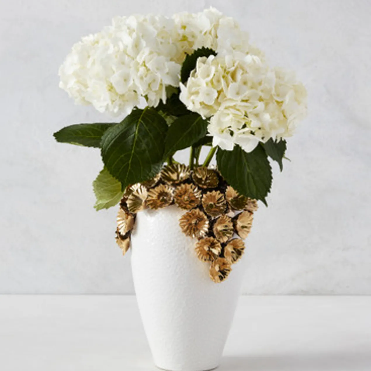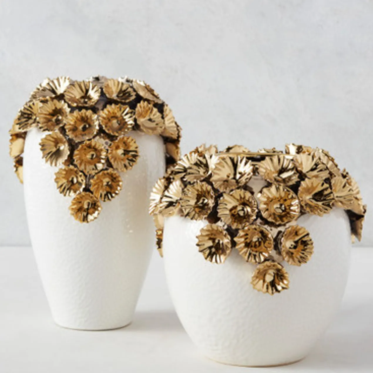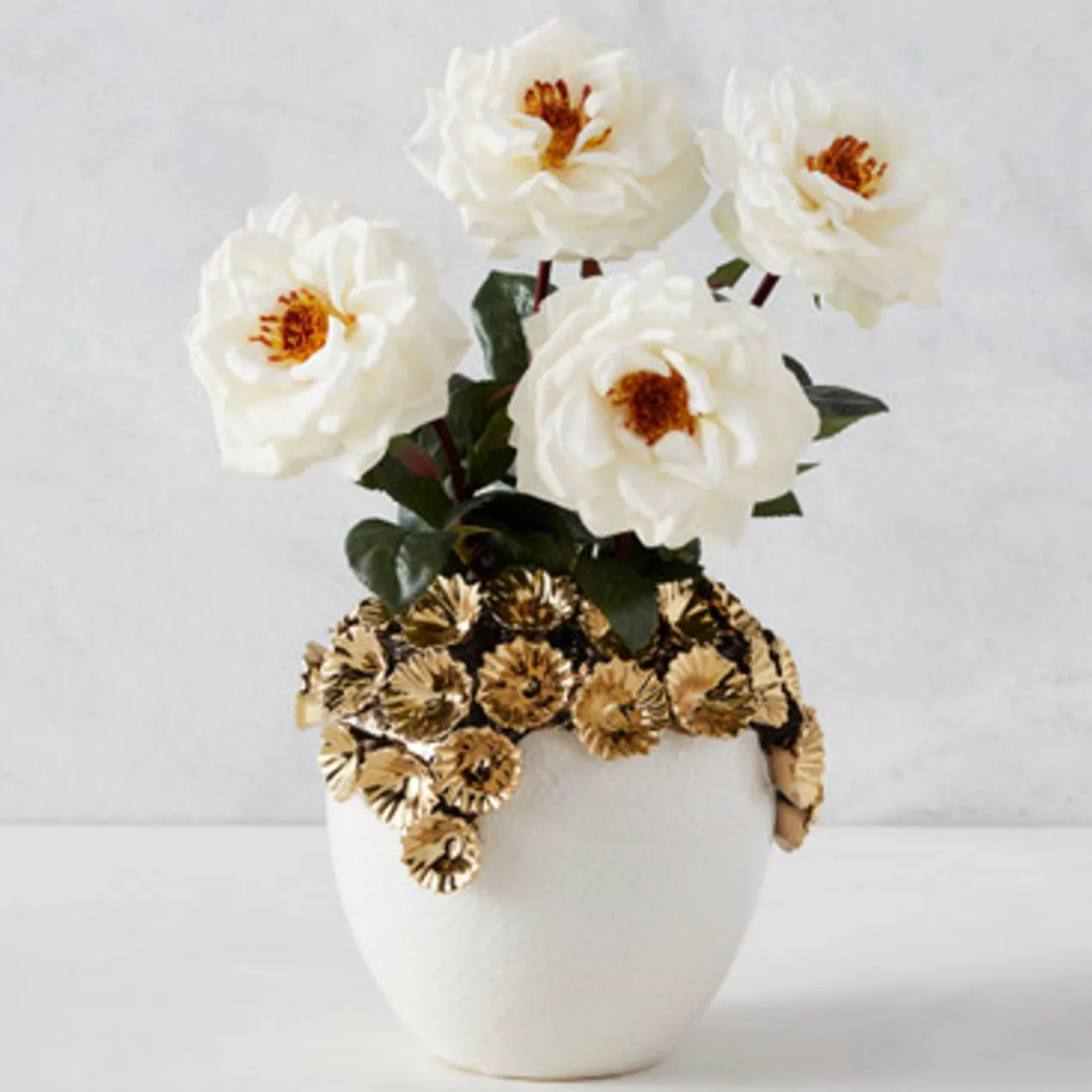 An eye-catching addition to any shelf or table, this vase is crafted of stoneware with a white finish and dimensional flower embellishments in gold.