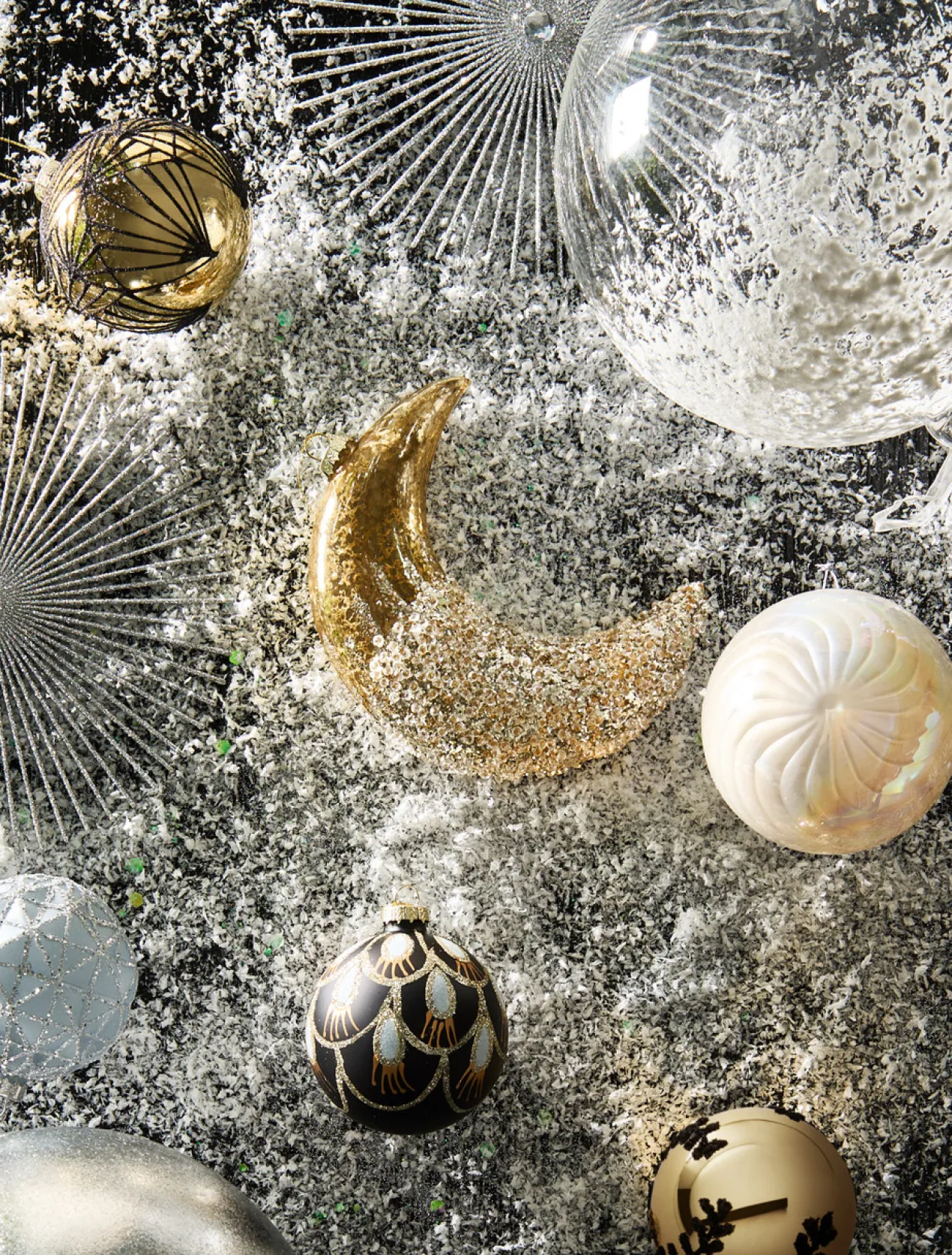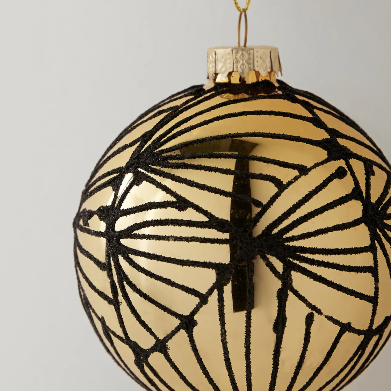 Adorn your tree with this polished gold ornament with geometric glitter detailing.