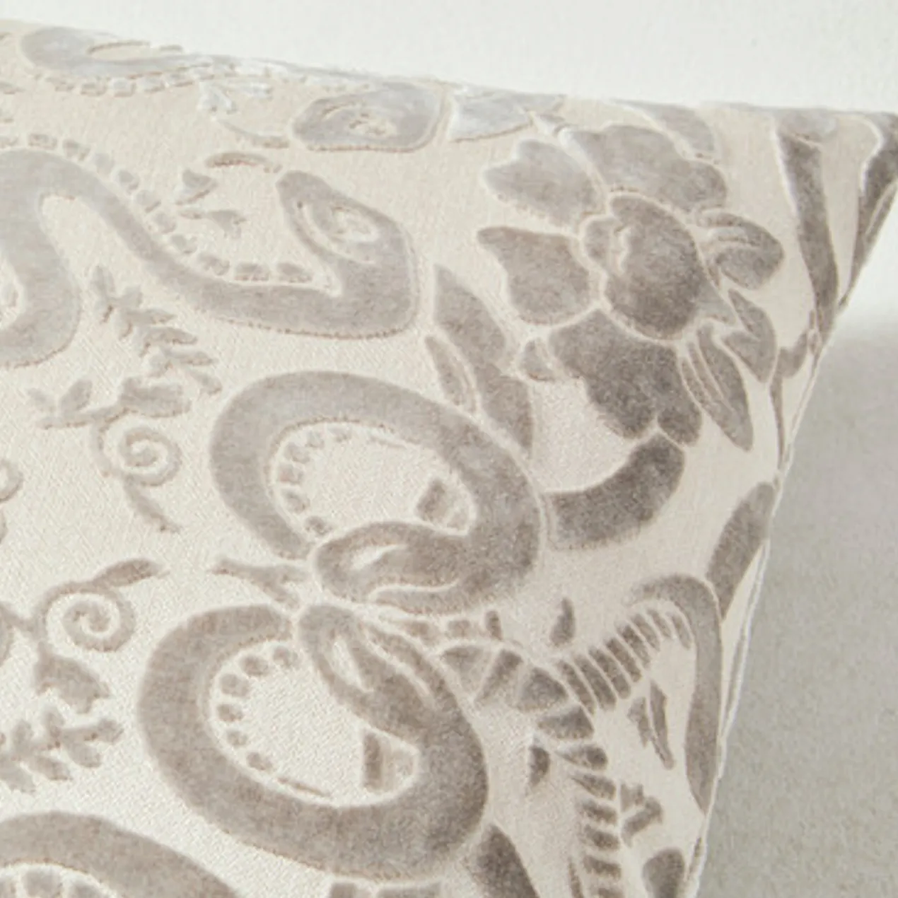 An intriguing snake-and-flower design pops on this cut-velvet pillow, making it a stunning accent for any sofa, bed, or chair. Insert included.
