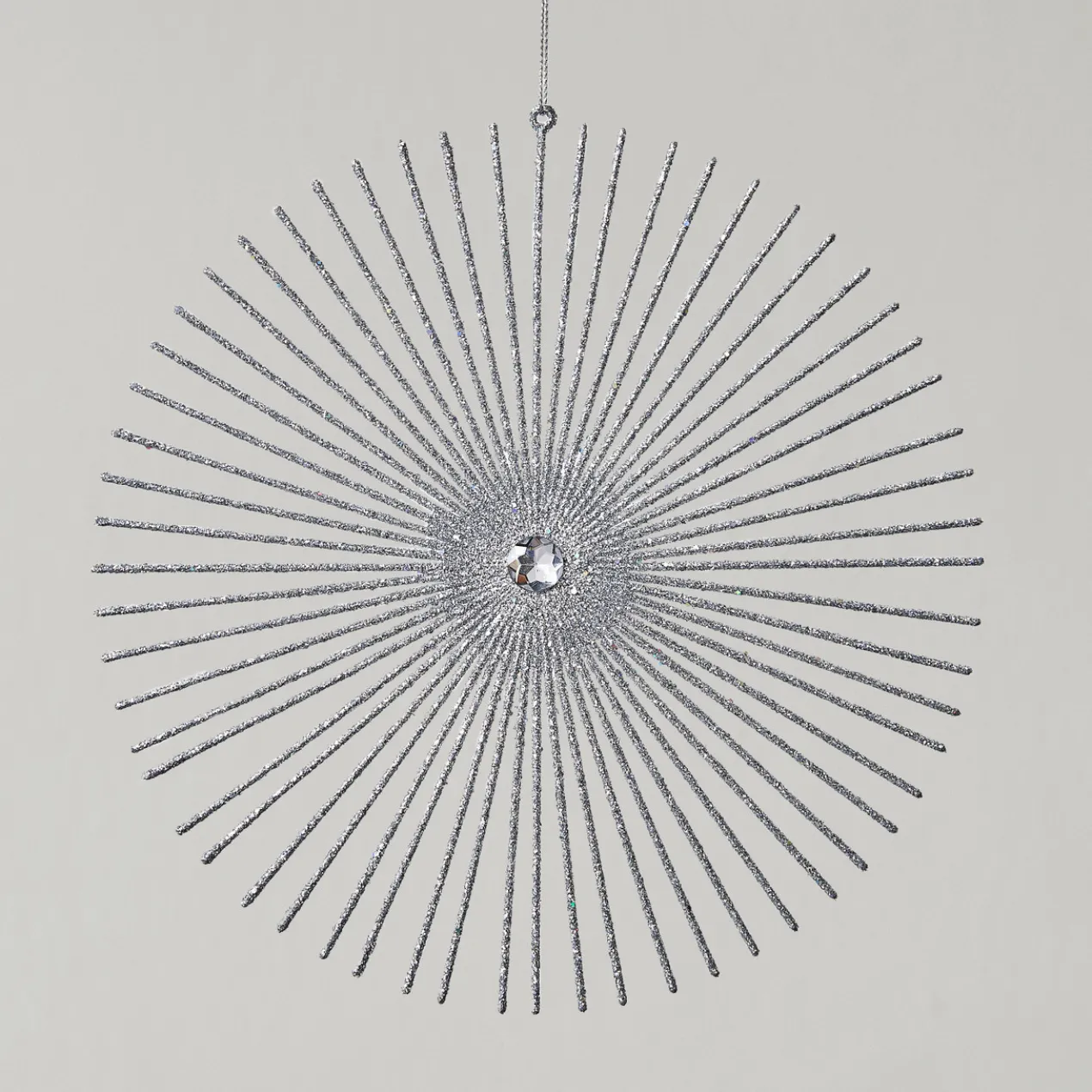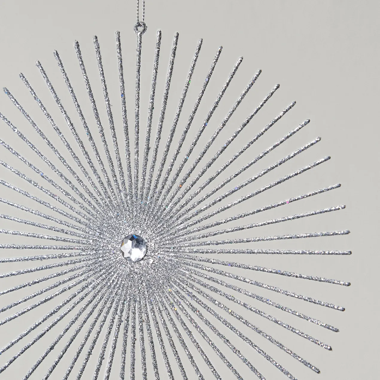 This oversized glittered starburst with jeweled center is the perfect ornament to finish your tree for some over-the-top glam.