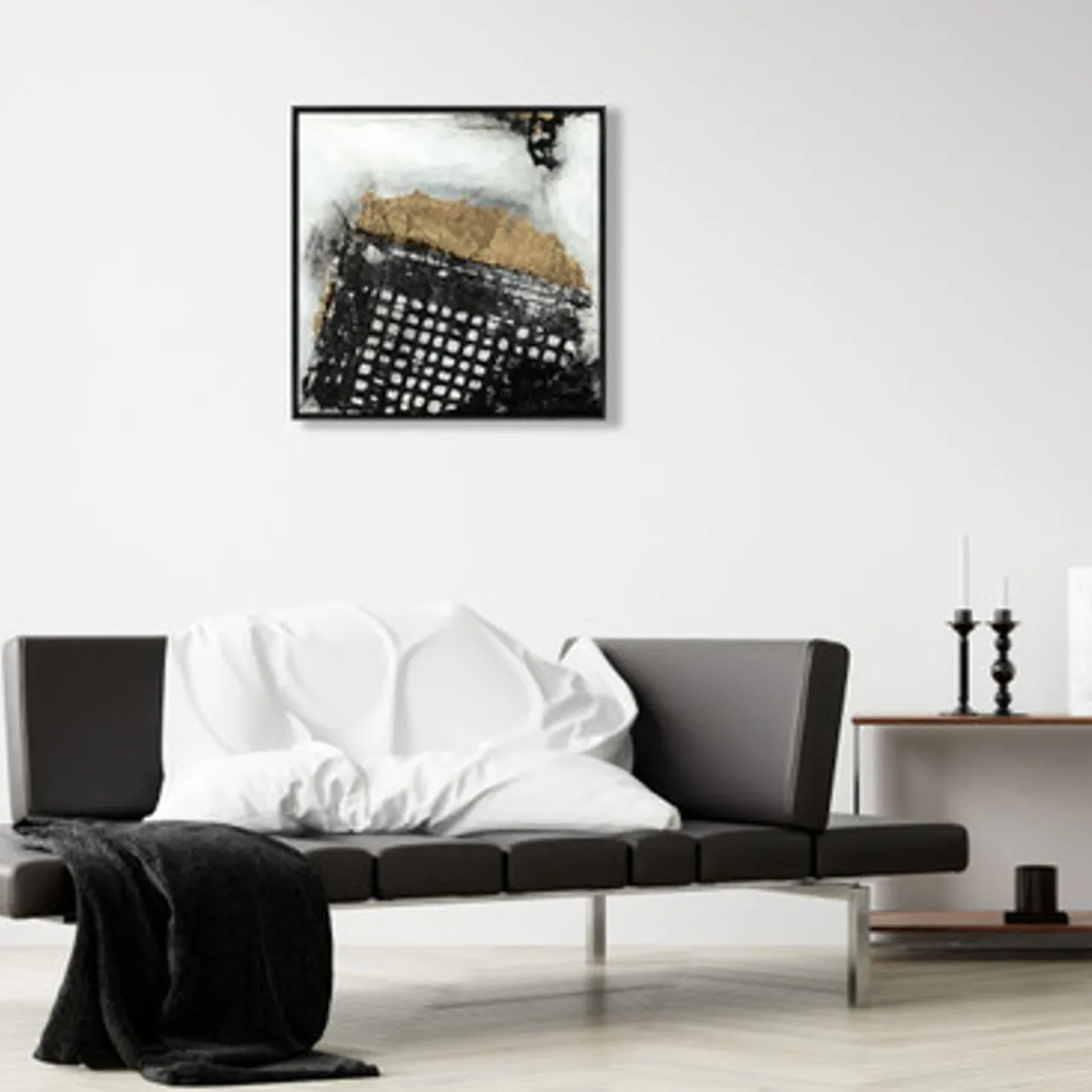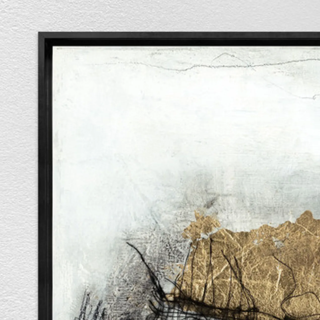 Gallery-wrapped canvas with hand-applied image brush gel finish. Set in a black floater frame.
