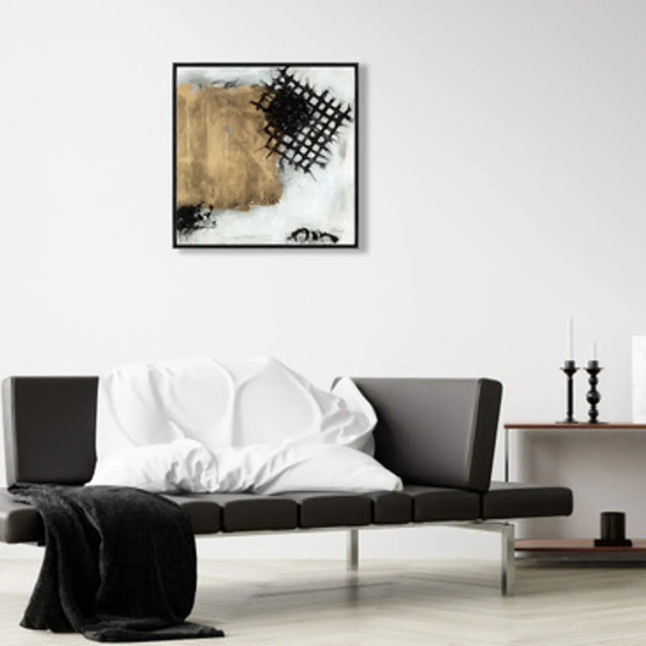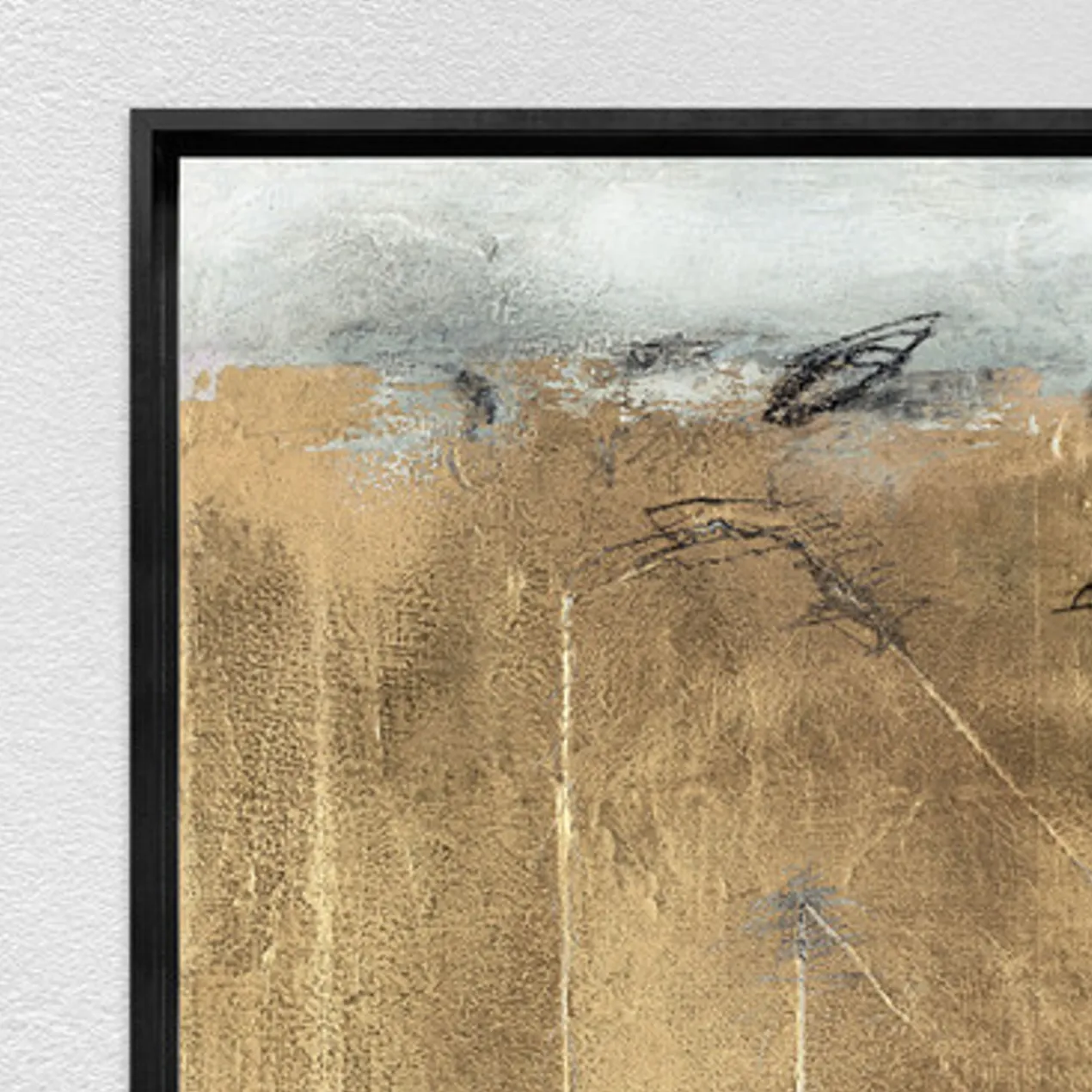 Gallery-wrapped canvas with hand-applied image brush gel finish. Set in a black floater frame.