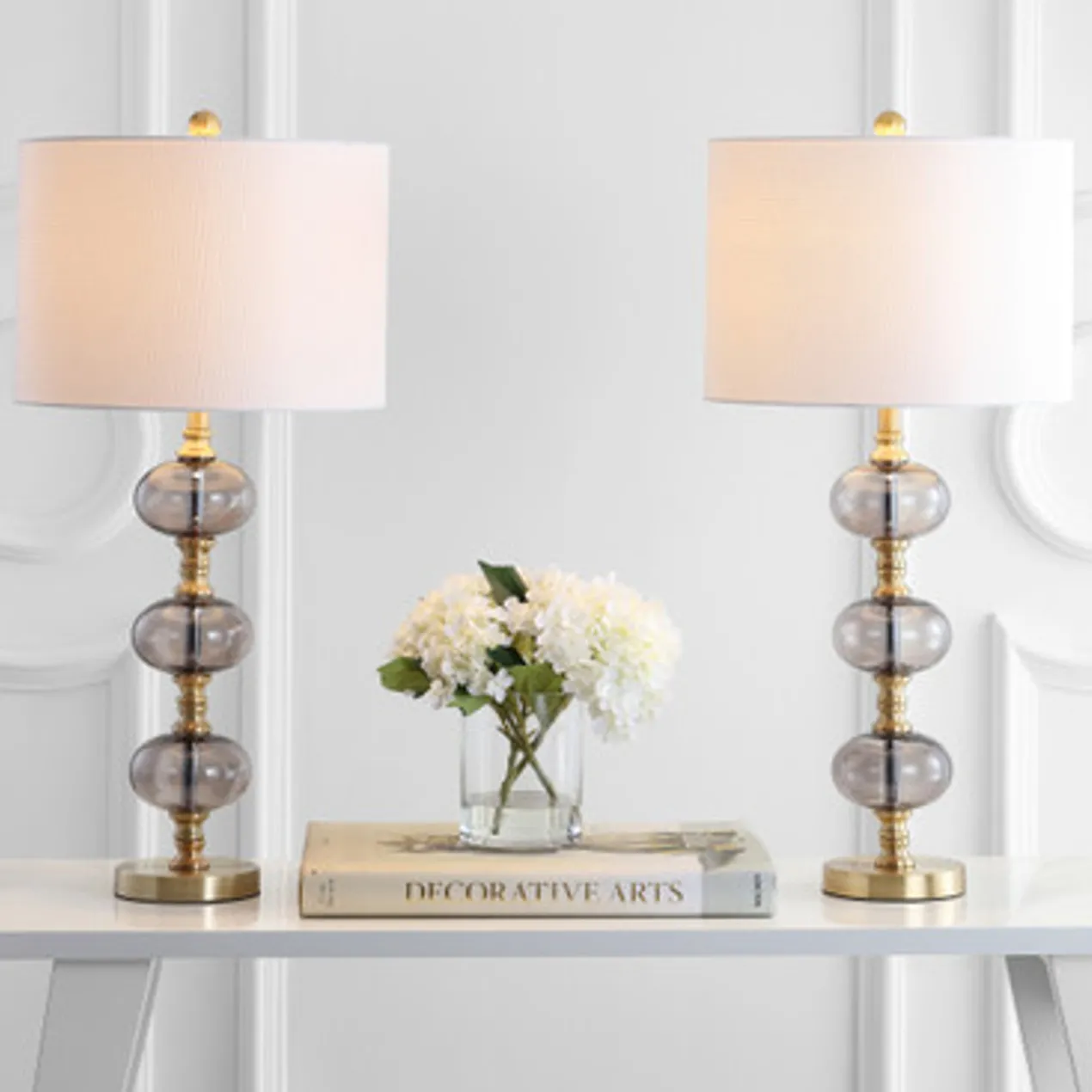 Dramatic and glamorous in its undulating silhouette, it’s pairing of smoke grey glass orbs and brass gold metal sculpture creates a jaw-dropping focal point in the living room or master suite.