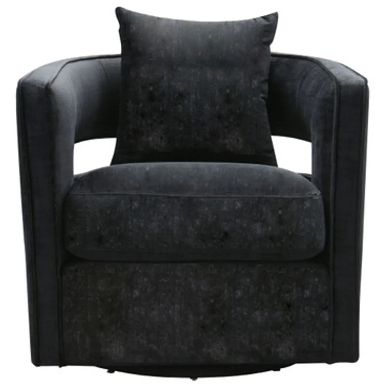 With its barrel back, cutout arms, and Black velvet upholstery, this swivel chair adds instant glamour to a room. A kiln-dried frame and plush foam-and-fiber fill ensure long-lasting comfort and support.