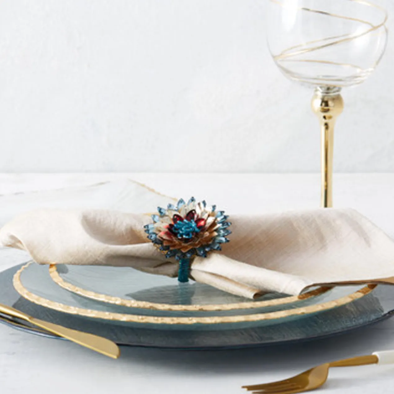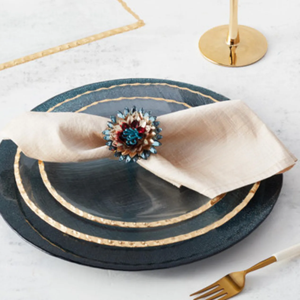 The Meze collection features textured glass on its underside with a smooth topside for a unique elegant effect. Gilded golden edging lends an exotic aesthetic.
