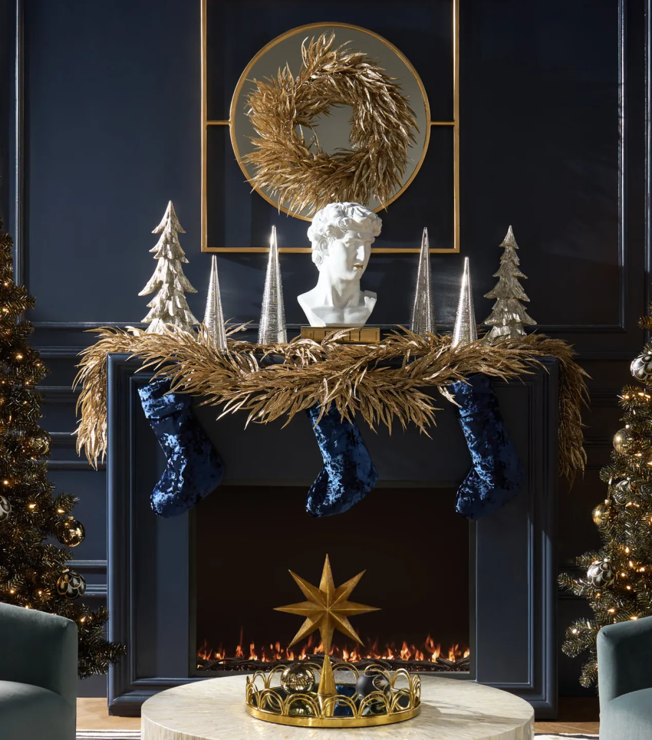A festive addition to your holiday decor, this faux tree comes pre-lit with warm white LED bulbs and makes a bold, modern statement in black and gold.