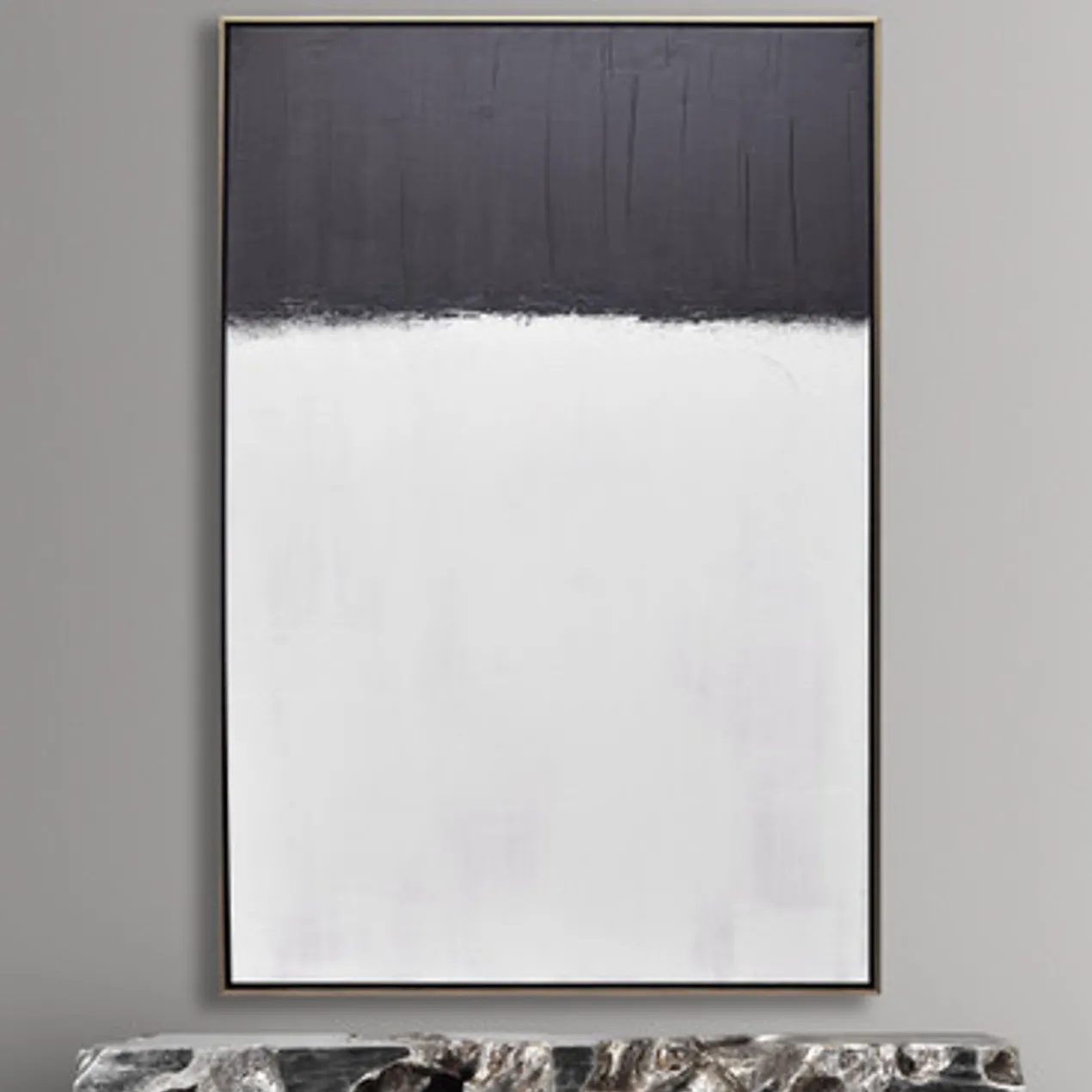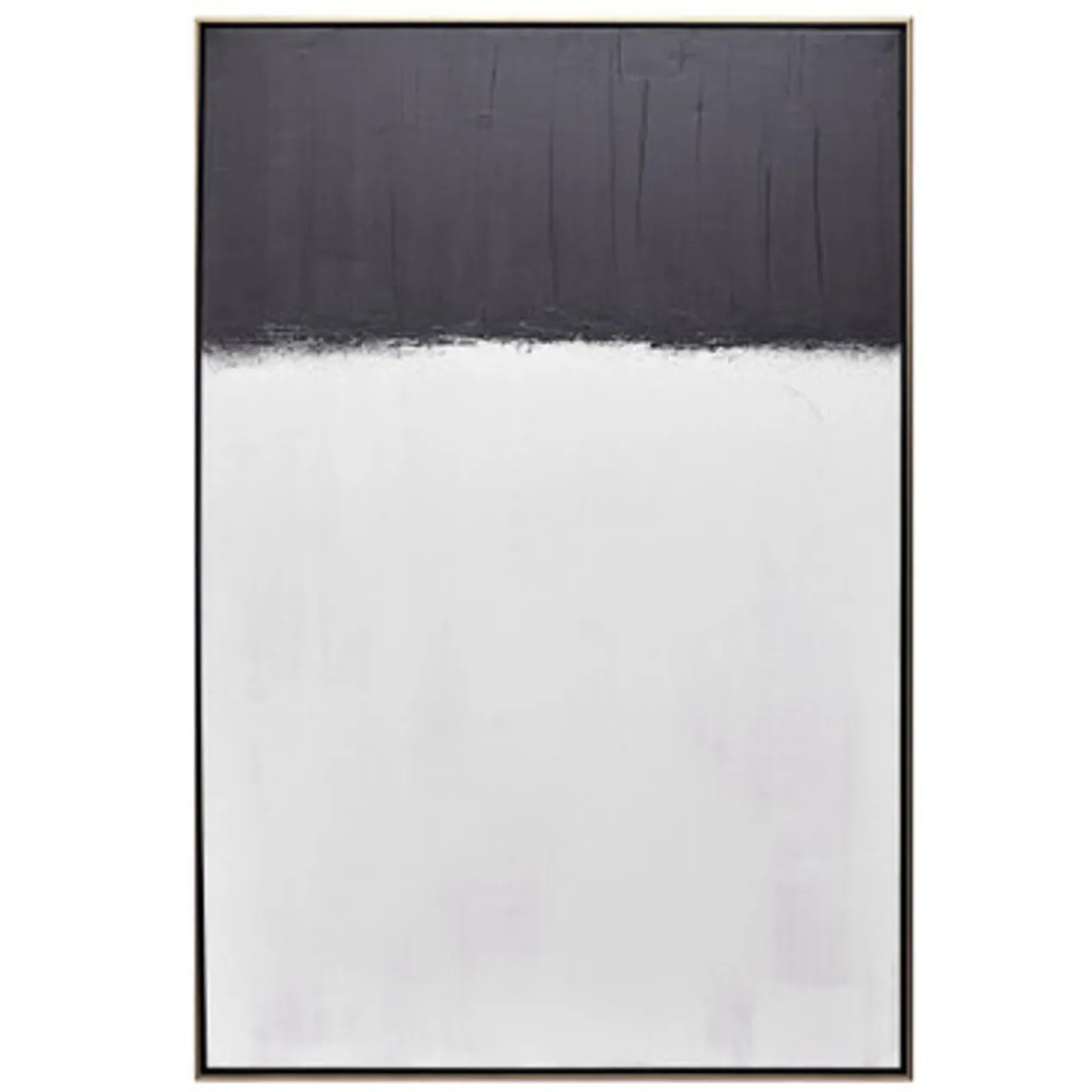 Bold brushstrokes in black and white add an incredible element of texture to this original work by artist Beverly Fuller. Painted on canvas, this piece is displayed in a gold floater frame.