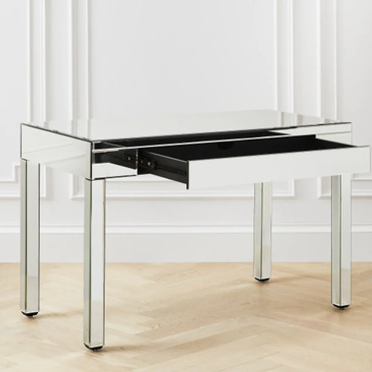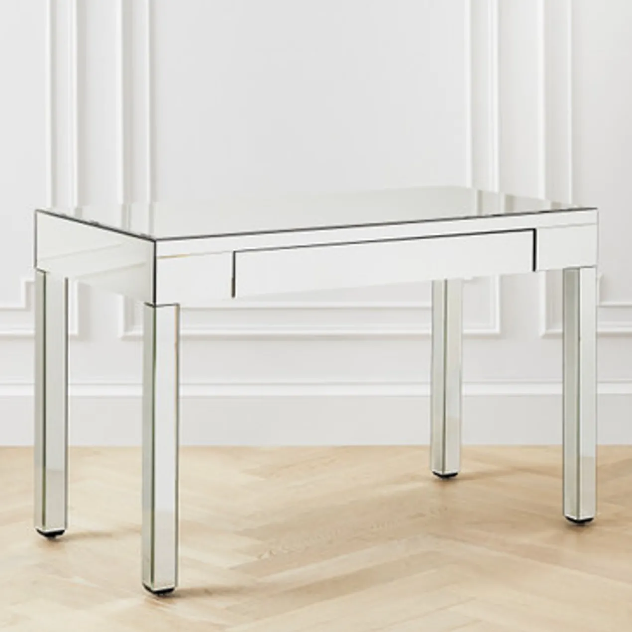Our mirrored Studio desk is a simple and classic design that will complement any décor in your home. Extremely stylish and functional, it is perfect for an entryway, behind your sofa, buffet table and ideal for keeping your home office organized. Perfect for small spaces, the Studio desk includes a full extension drawer, and pre-drilled holes for device cord management.