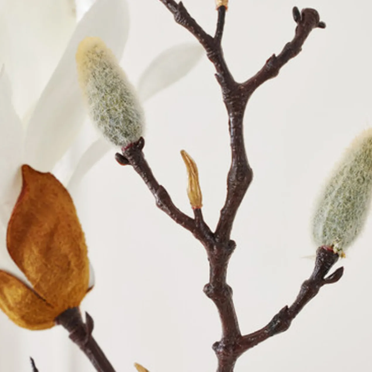 Faux magnolia blossoms make effortless floral arrangements. Pliable wired stems allow for flexibility in arranging.