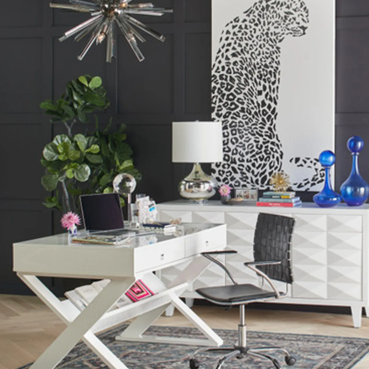 Rendered with thick, glossy black paint, the spots of the cheetah in this original work from artist Beverly Fuller pop against a white background. Painted on canvas, this piece is unframed.