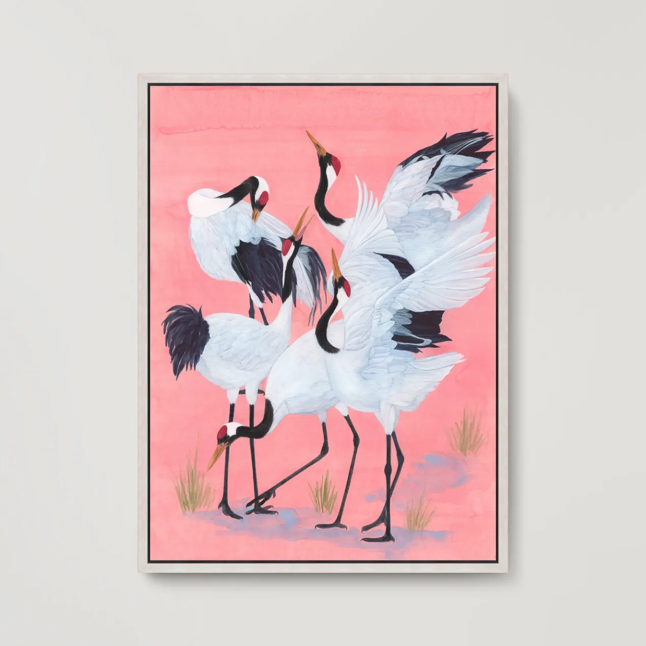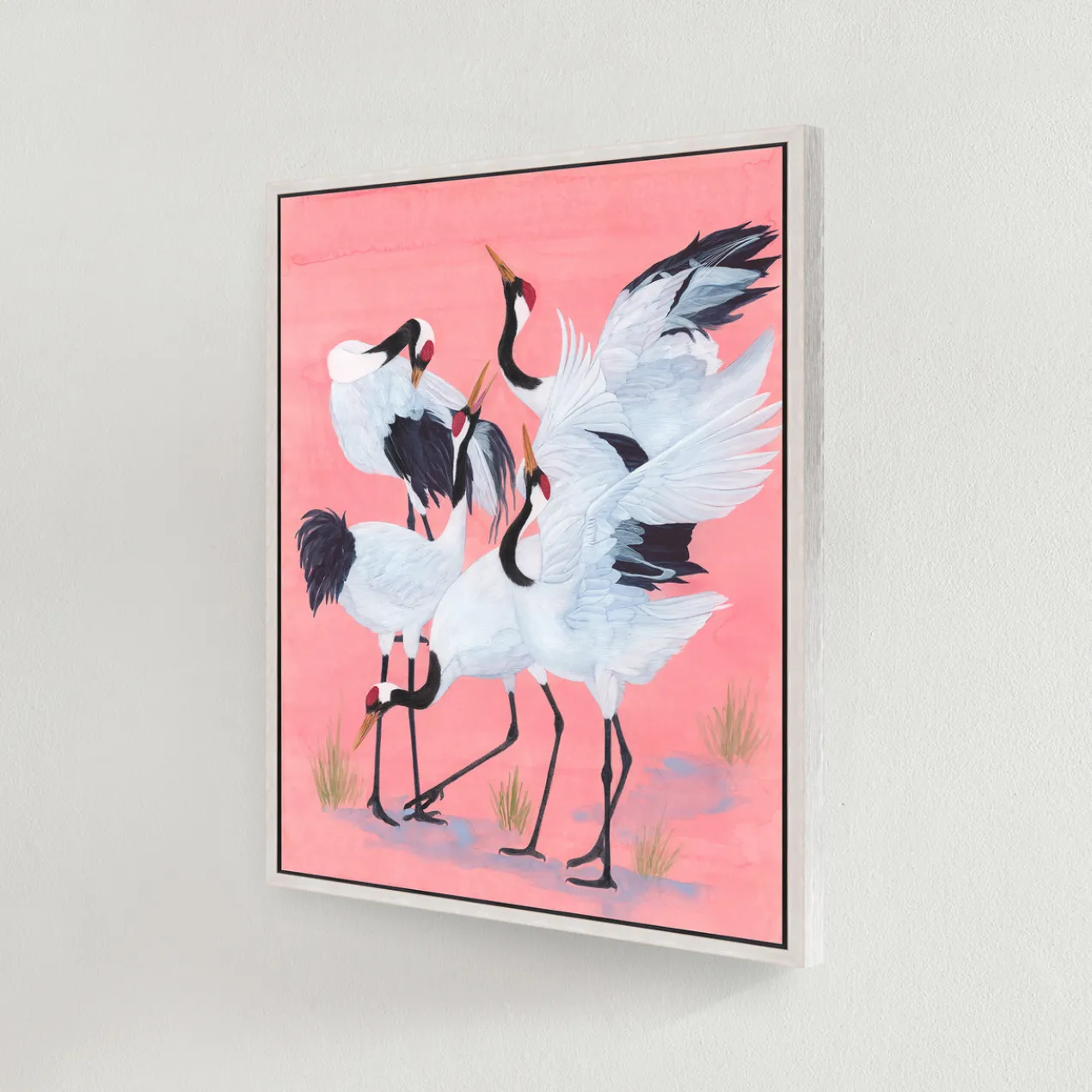 - Set in a white floater frame.