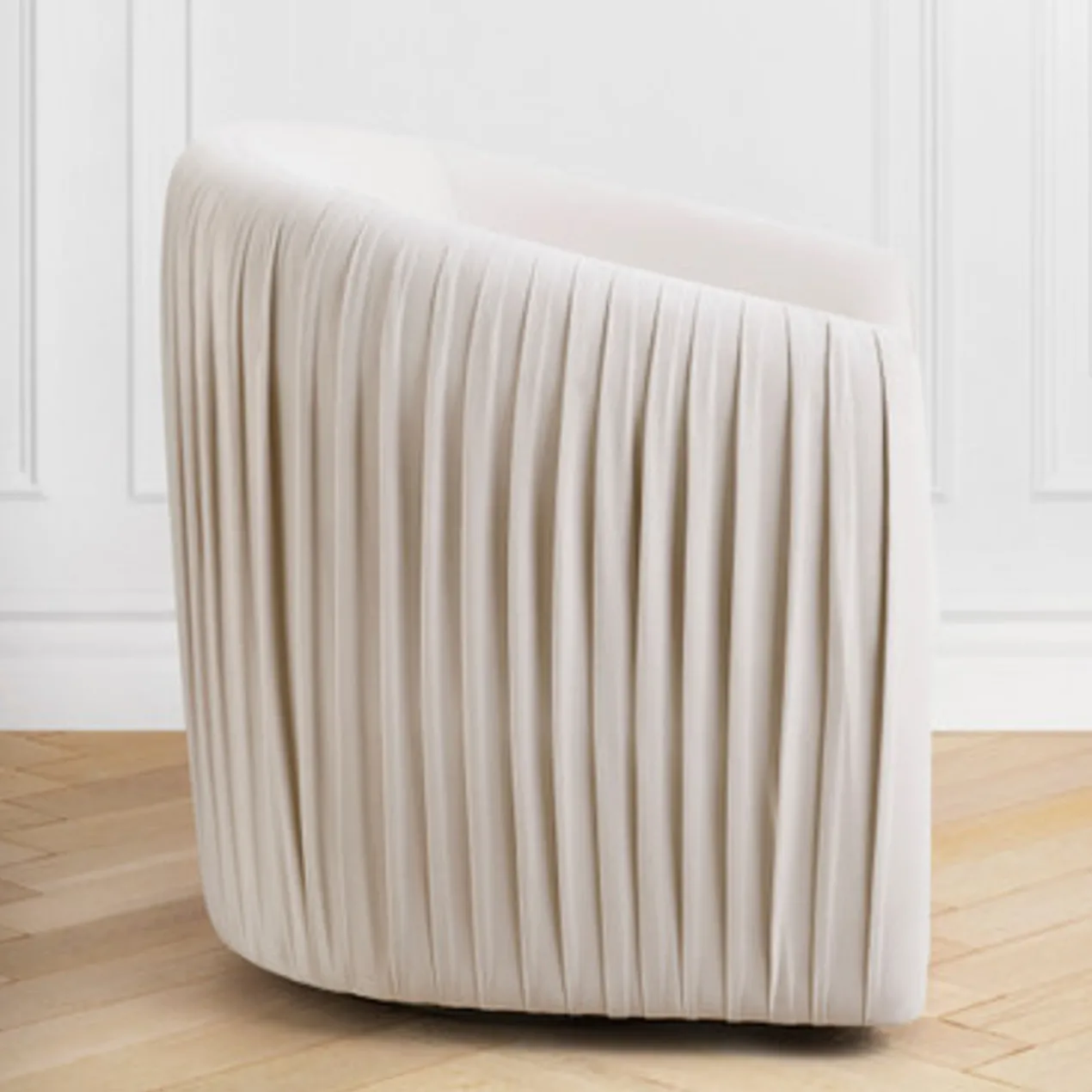 Offering style at every angle, our Aria chair is framed in kiln-dried hardwood with a classic barrel silhouette and convenient swivel feature. Choose from channeled, pleated, or tufted tailoring in over 30 gorgeous fabrics for a look you’ll love. Shown in Bella Velvet Pearl.