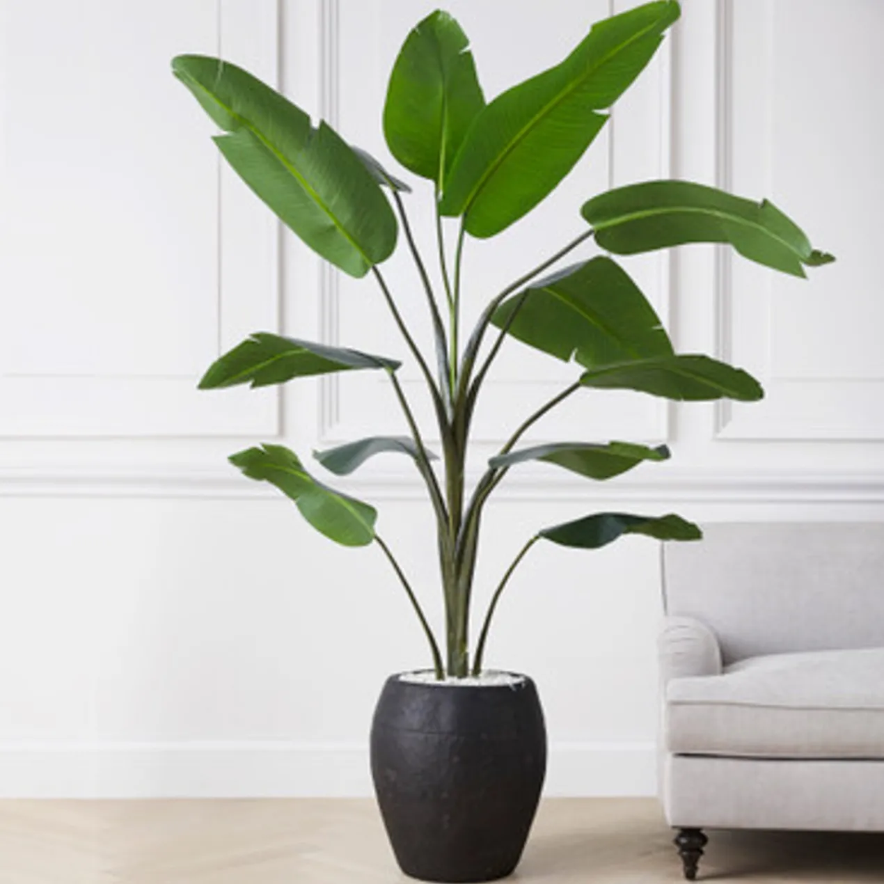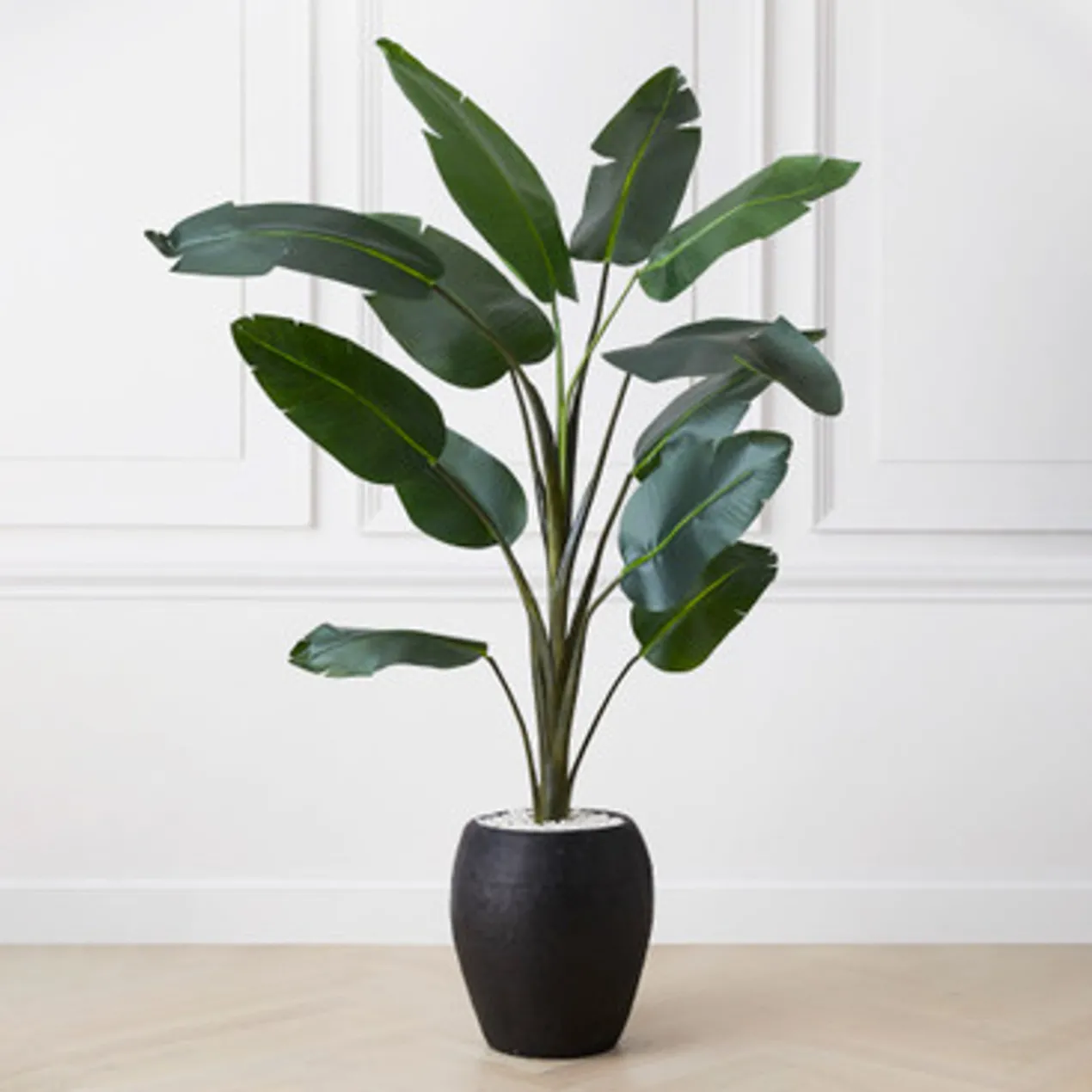 Housed in a black pot, this lifelike banana palm plant brings a splash tropical flair to the scene.