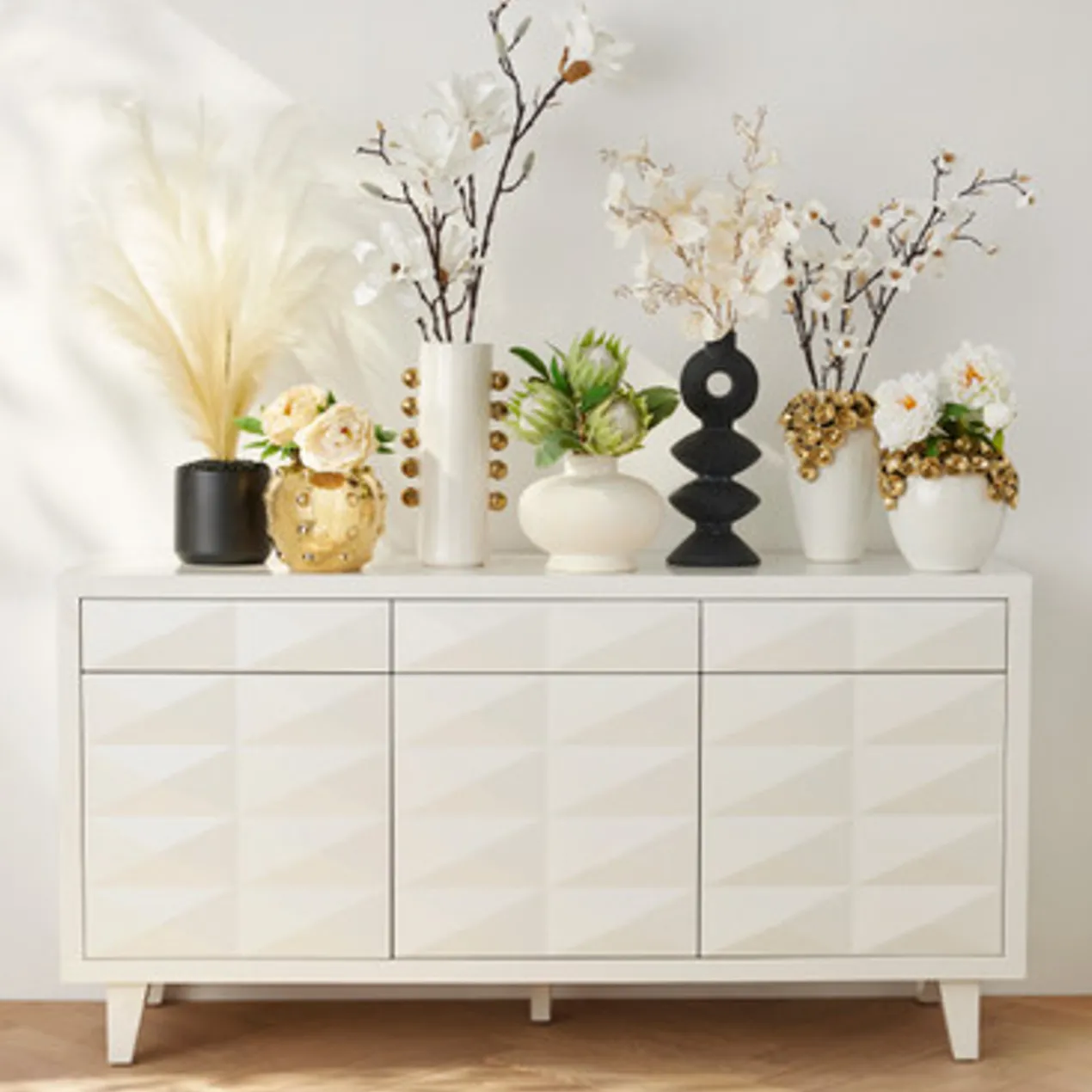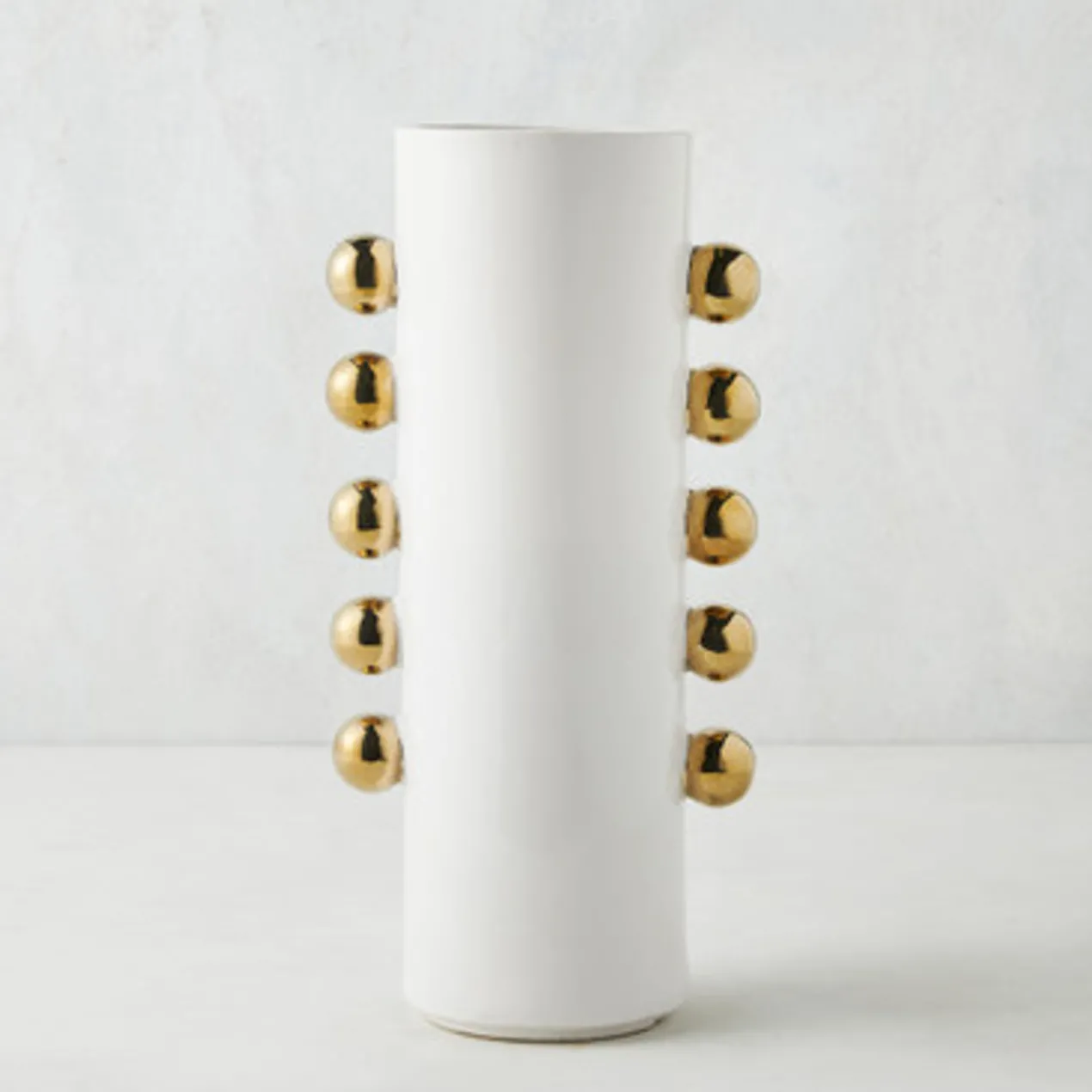 An eye-catching addition to any shelf or table. This vase is crafted of ceramic with a bright white finish and dimensional bauble design in gold.