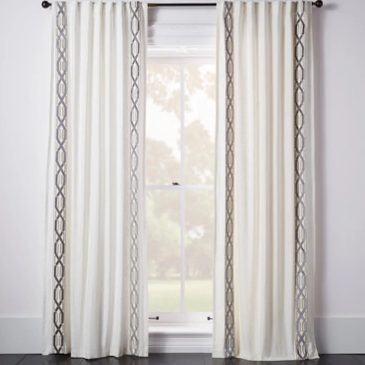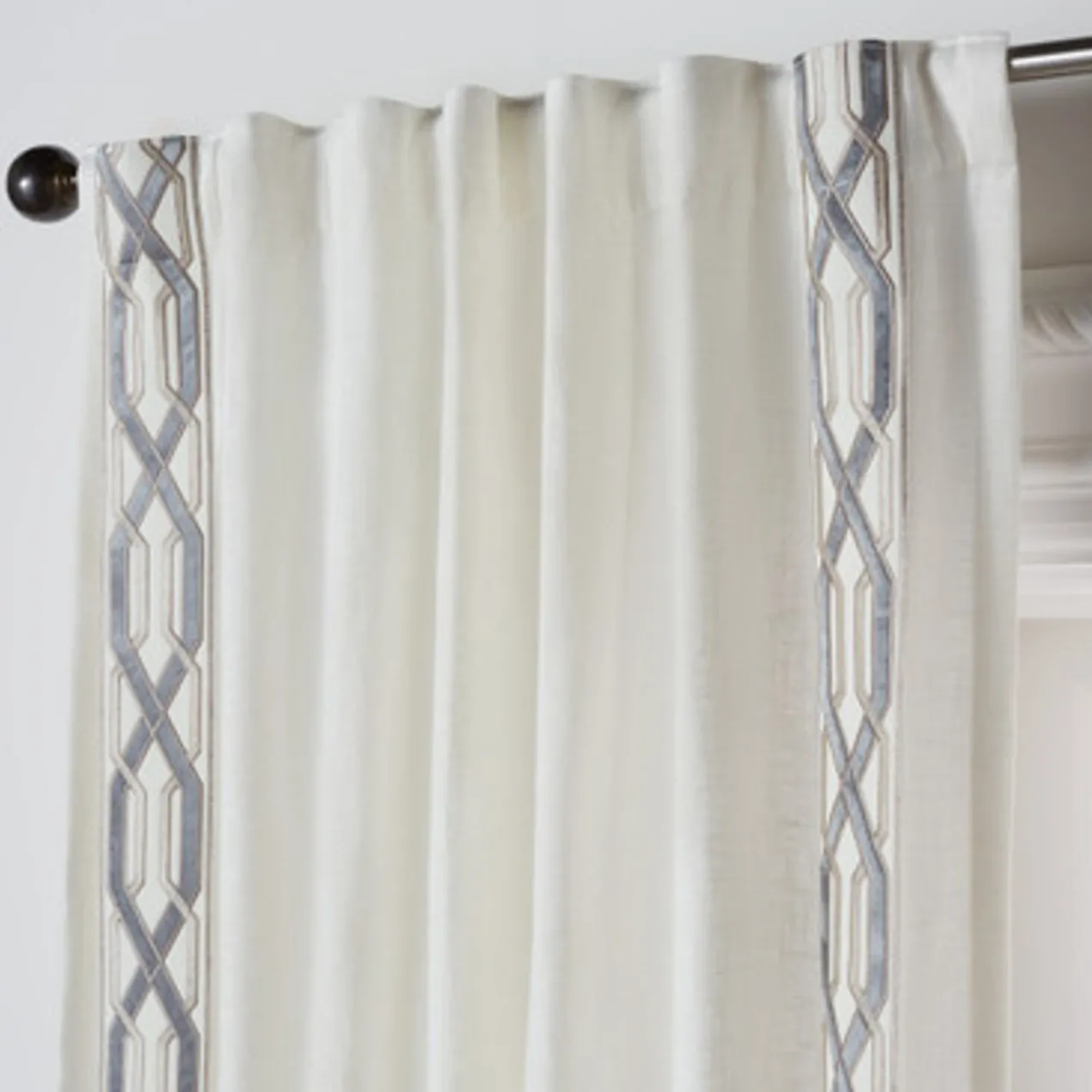 Made from linen-blend fabric for a lovely drape and rich texture, our customizable Chloe Border Panel is offered in four lengths (84”, 96”, 108”, or 120”), two header styles (rod pocket or inverted pleat), and two lining options (single privacy lining or lining and thermal interlining) to fit your space. Choose from seven tape borders—detailed with plush velvet appliqués, jacquard weaving, and embroidery—in classic yet refreshingly modern patterns that frame your windows in high style. Sold as a single panel.