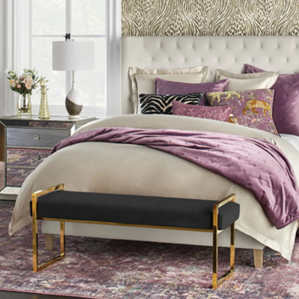 Our comfortably chic Clara bench is the perfect addition to any space. A plush upholstered seat cushion sits atop two open metal legs featuring a metallic gold finish for added style. Shown in Kenley Chenille Quartz.