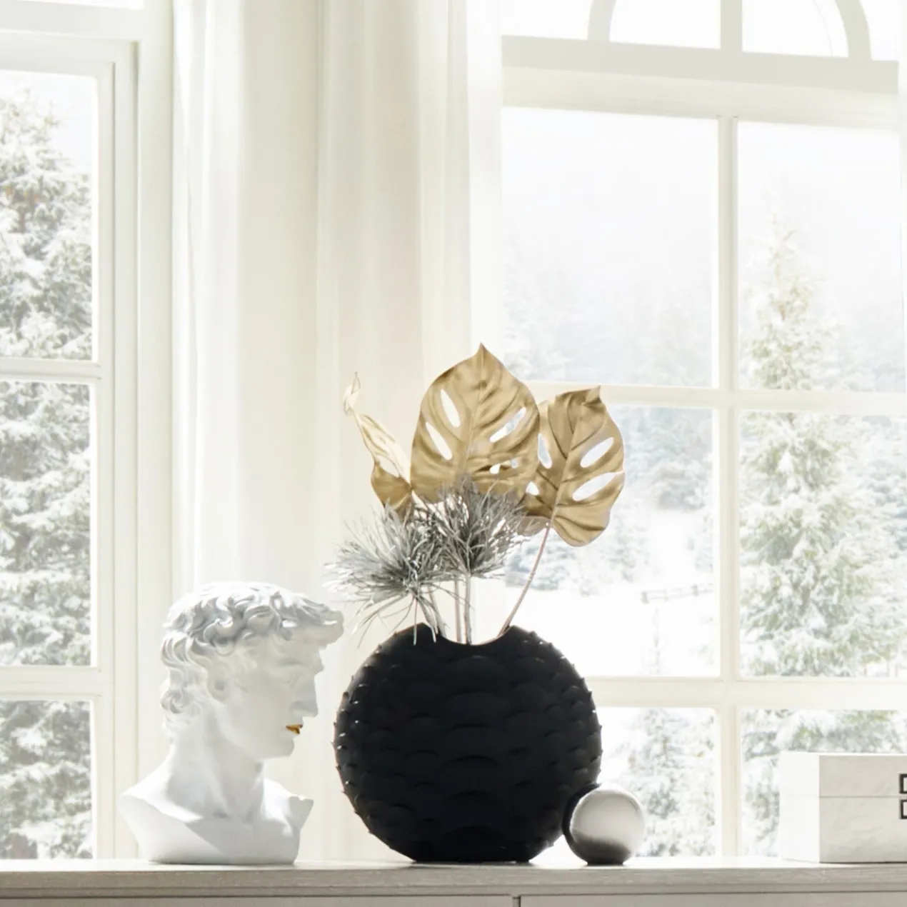 A stunning accent even when it’s not holding blooms or branches, this floor vase is made from lightweight resin with a matte black finish and textural scalloped design reminiscent of snake scales.