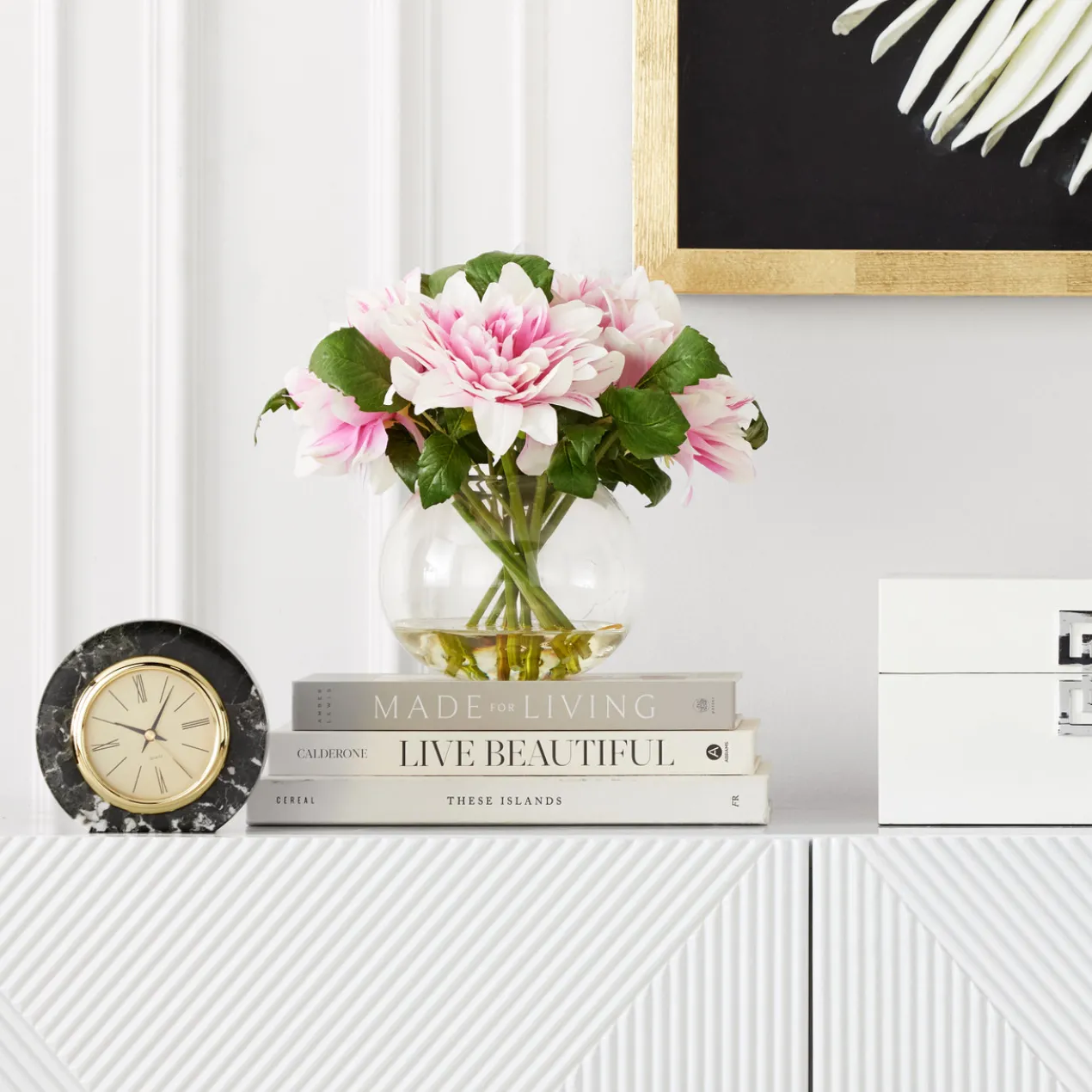Housed in a glass vase, this stunning faux-dahlia arrangement will look lush and lifelike all year long. Still “water” adds a realistic touch.
