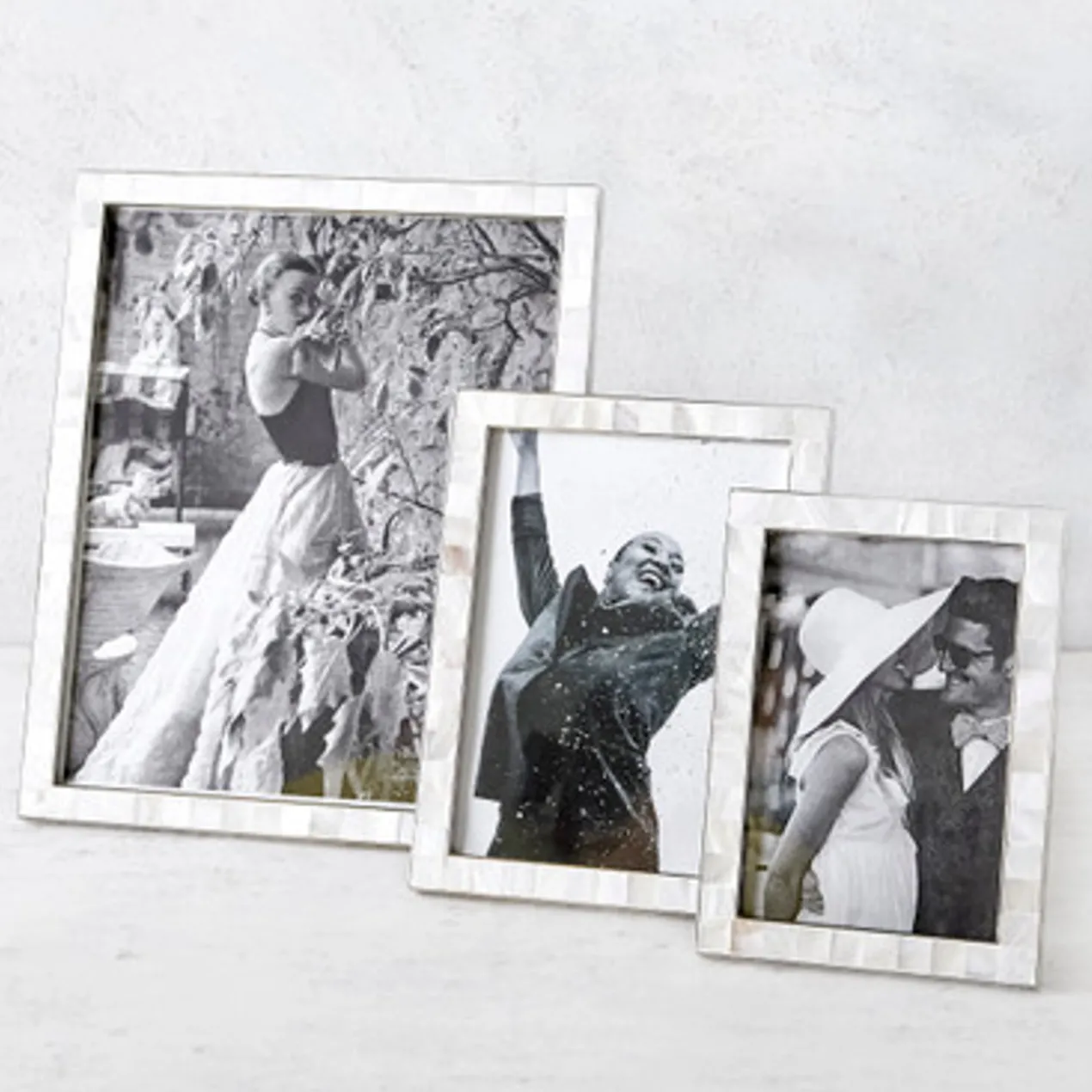 Crafted with mosaic iridescent pearl tiles and silver detailing, this frame is ideal for holding a cherished photo in style.
