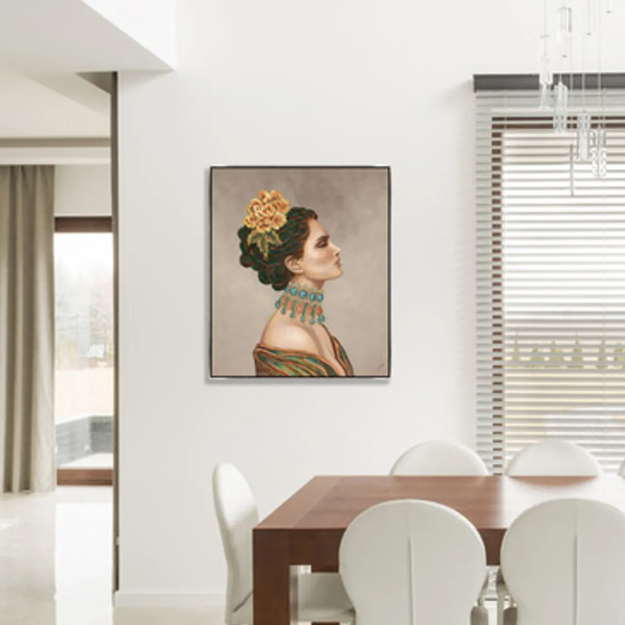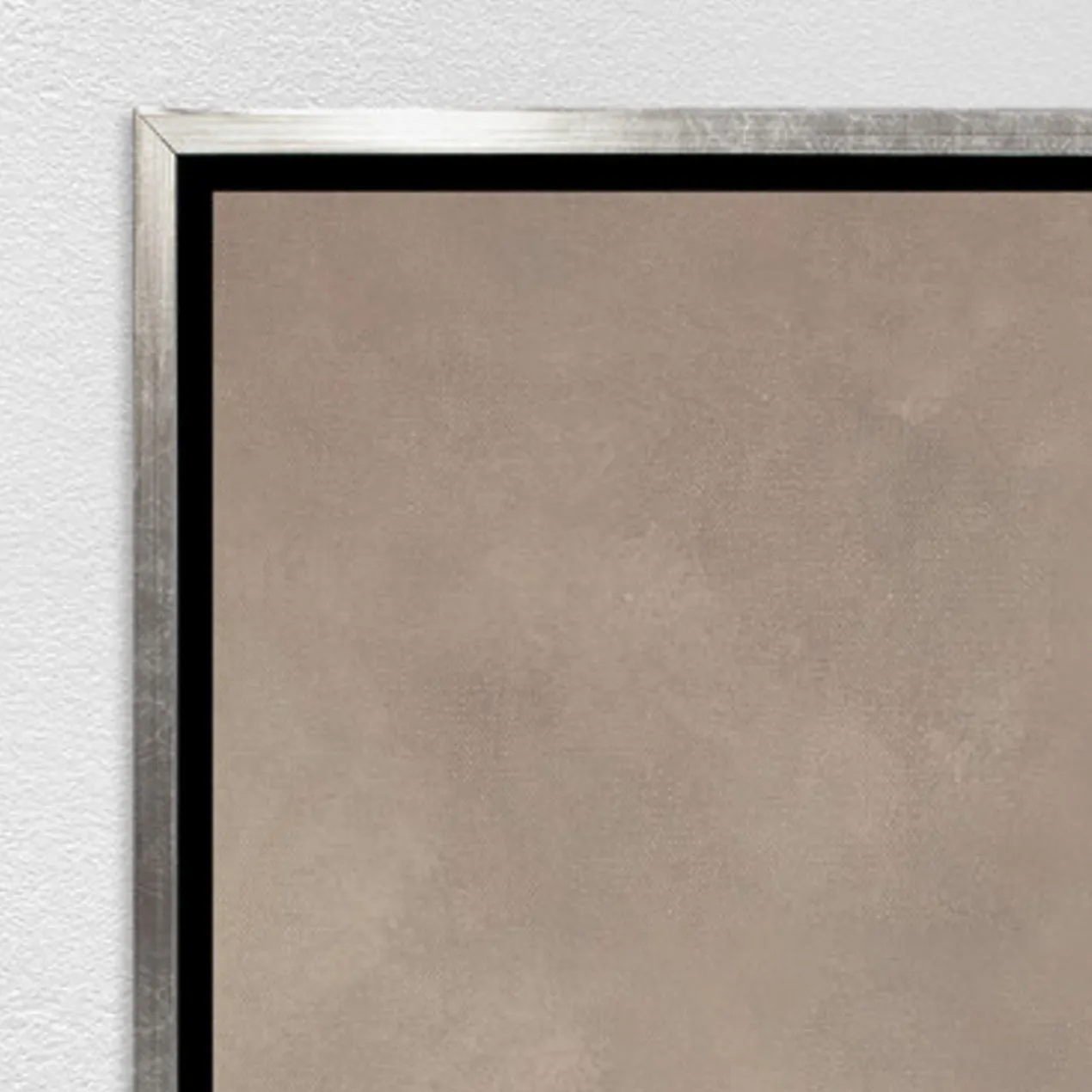 Gallery-wrapped canvas with hand-applied image brush gel finish. Set in a silver floater frame.