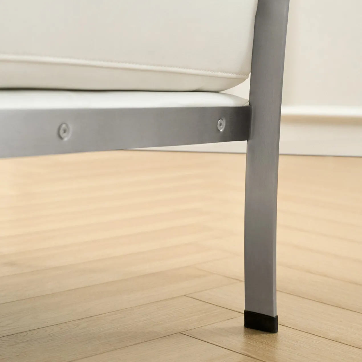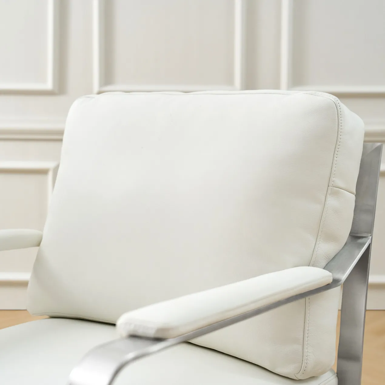 This armchair is a stylish and versatile addition to both living rooms and offices. Its modern design features genuine leather upholstery, offering a luxurious and comfortable seating experience. The solid stainless steel frame provides durability and stability, while the flat iron legs ensure a sleek and contemporary look. Equipped with foot caps, this chair prevents floor scratches, making it ideal for any room. Best of all, it arrives fully assembled and ready for immediate use. Suitable for those who appreciate a blend of sophistication, comfort, and practicality in their furniture.