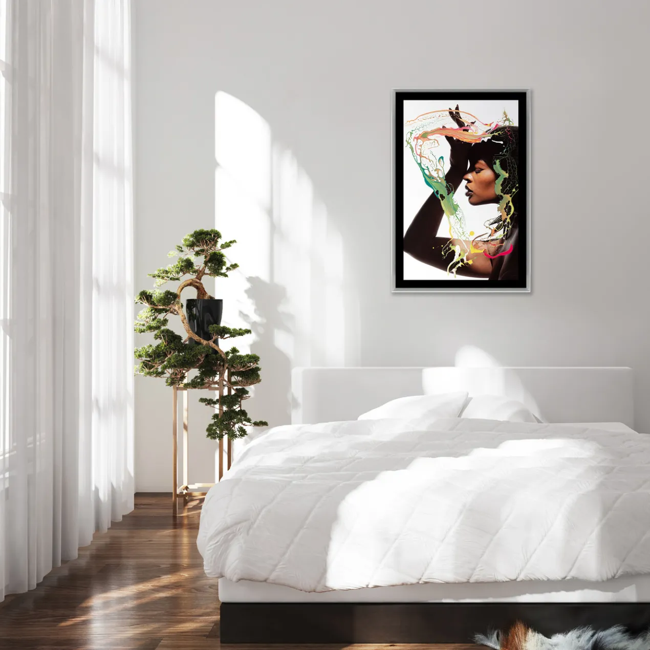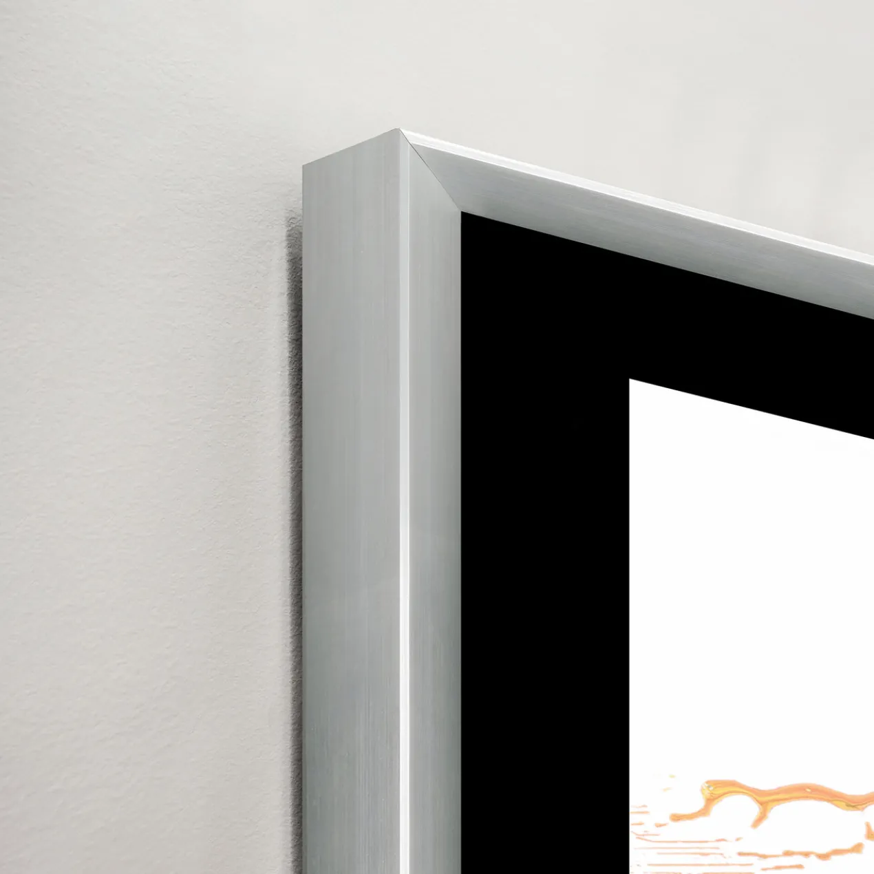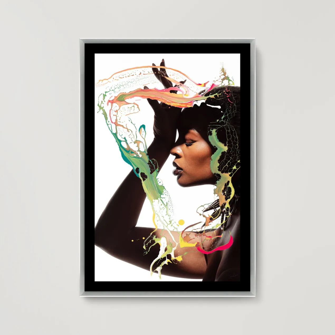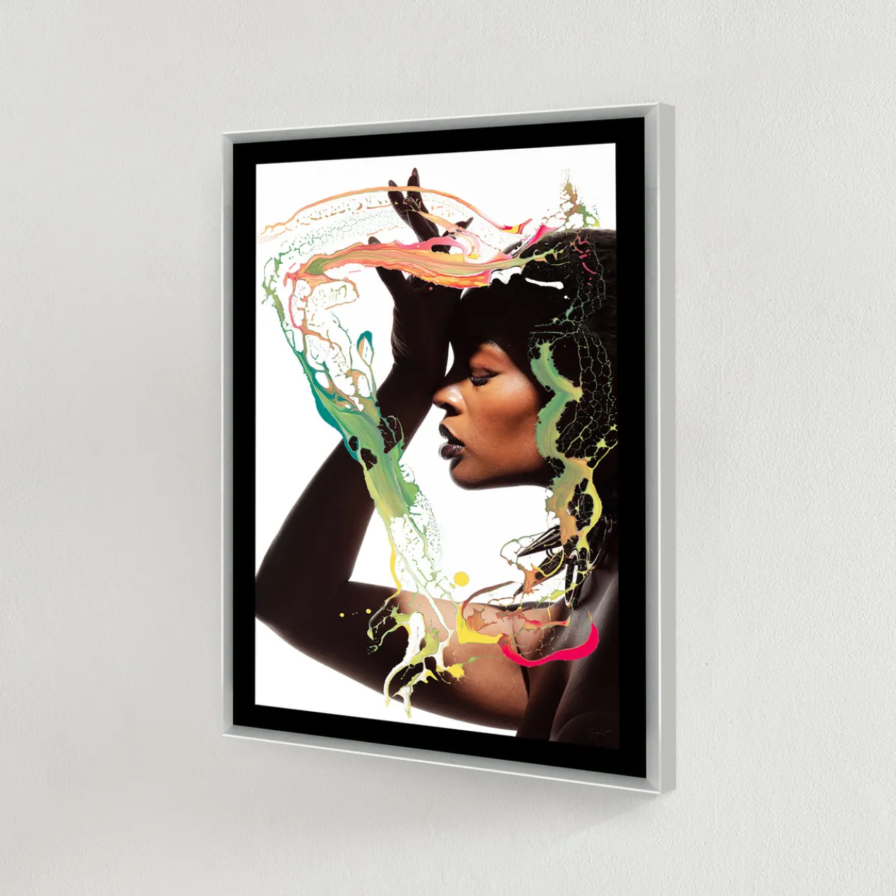Image printed on artist paper floating on black matboard under acrylic glass encased in a silver frame.