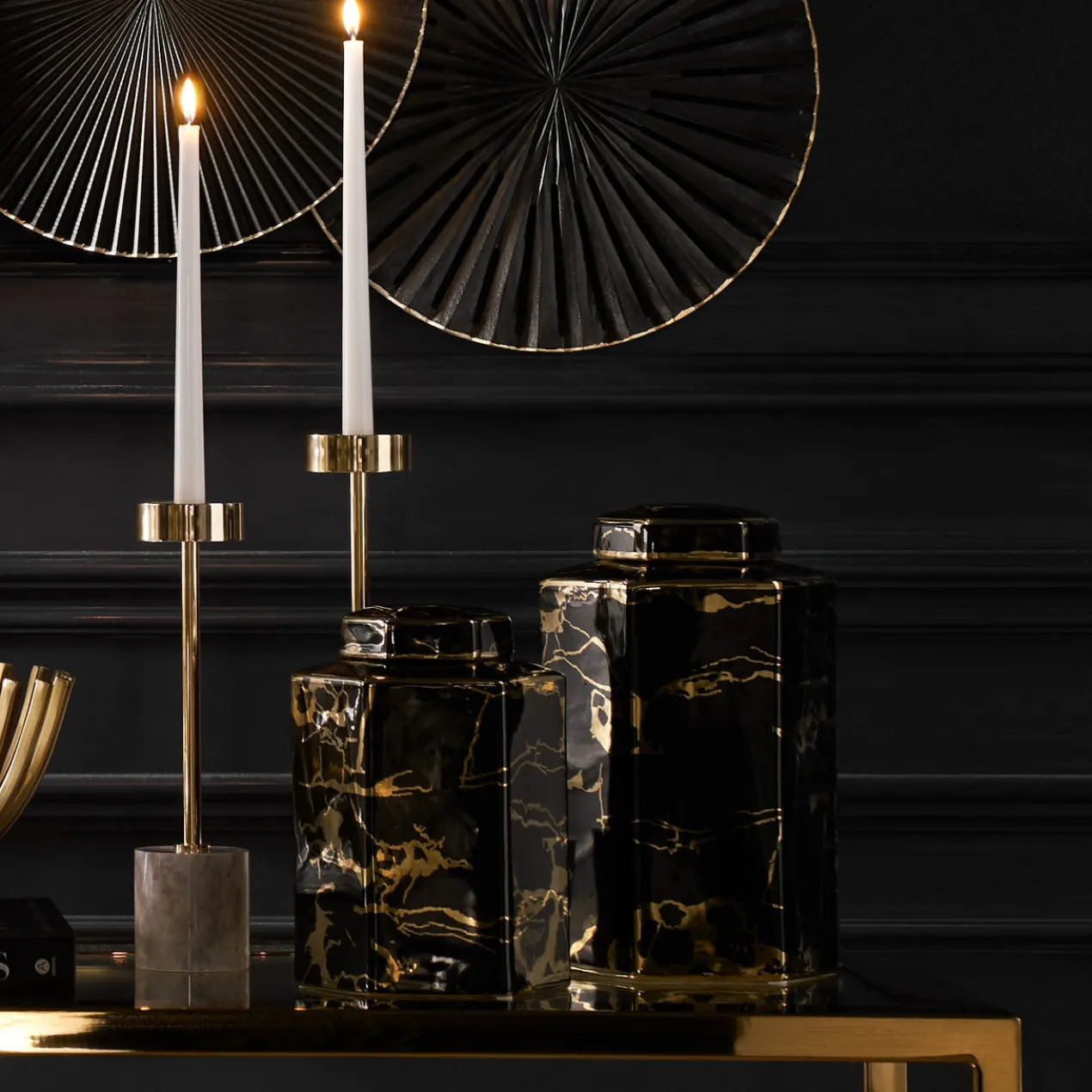 An elegant addition to a tabletop display, this hexagonal canister is crafted of ceramic with a swirling, marble-inspired finish.