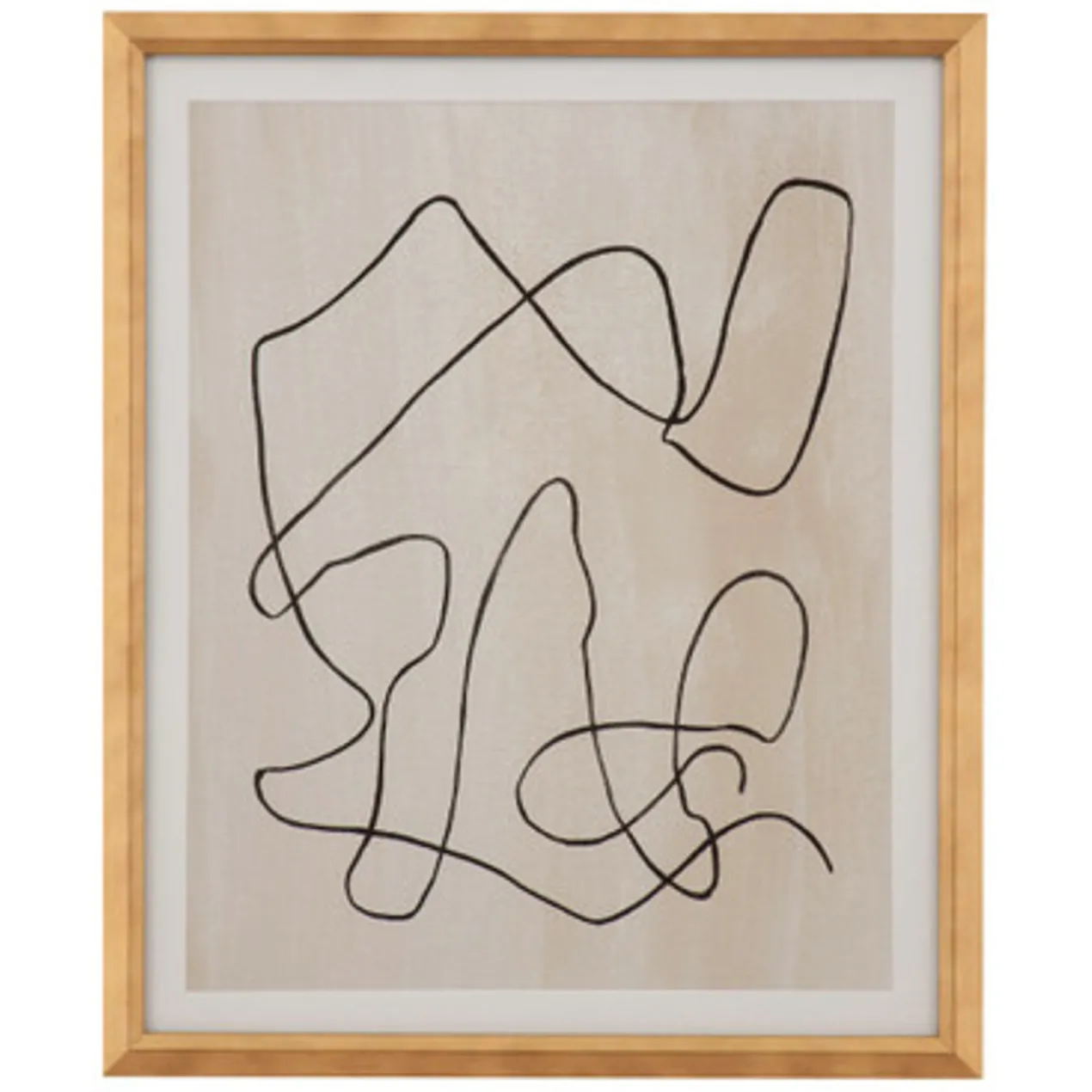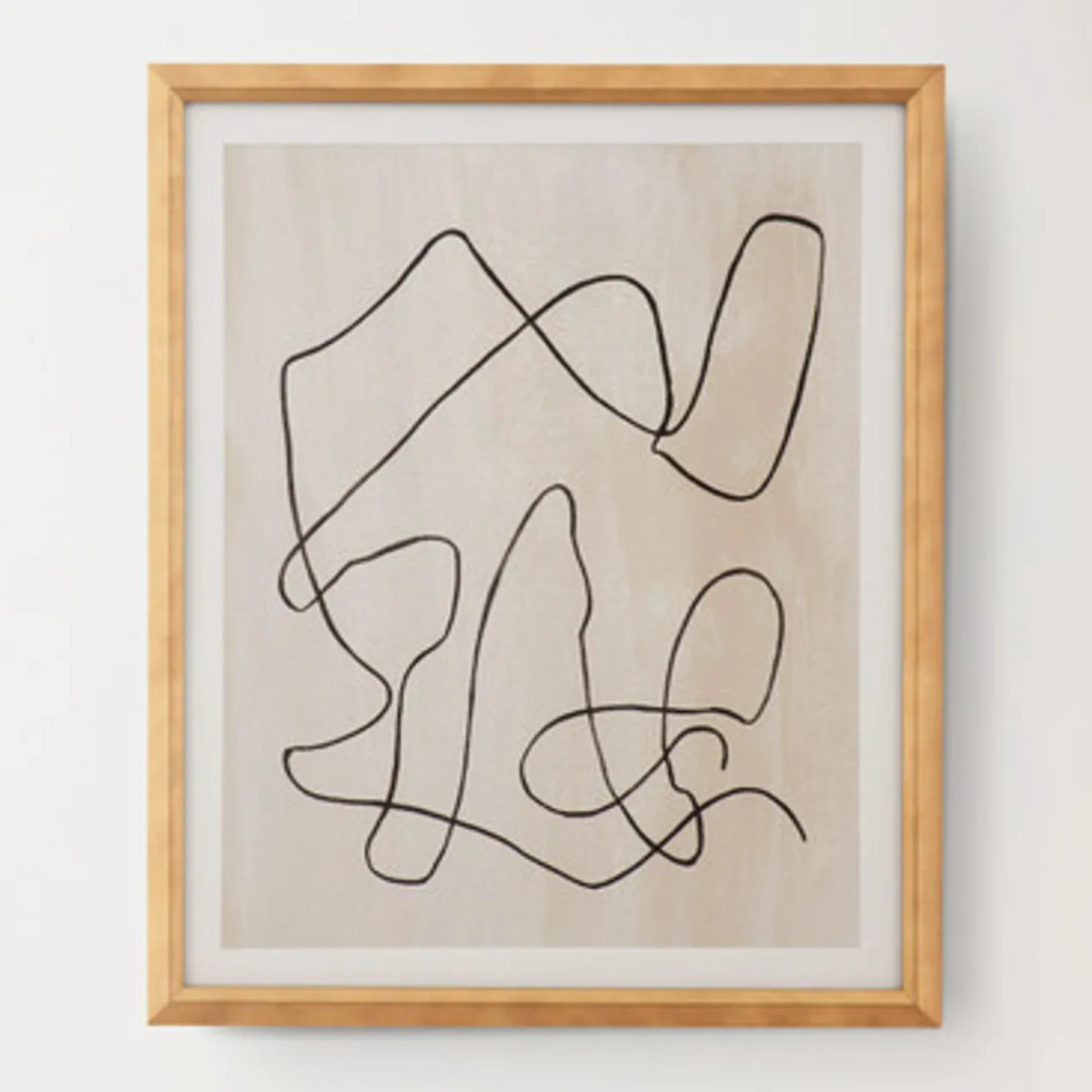 Our Maze art series features abstract ink scribbles on a cream background with white border and a simple natural wood frame.