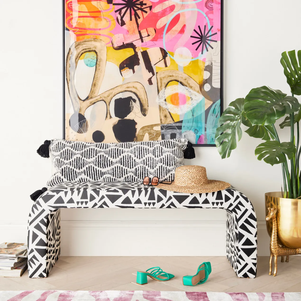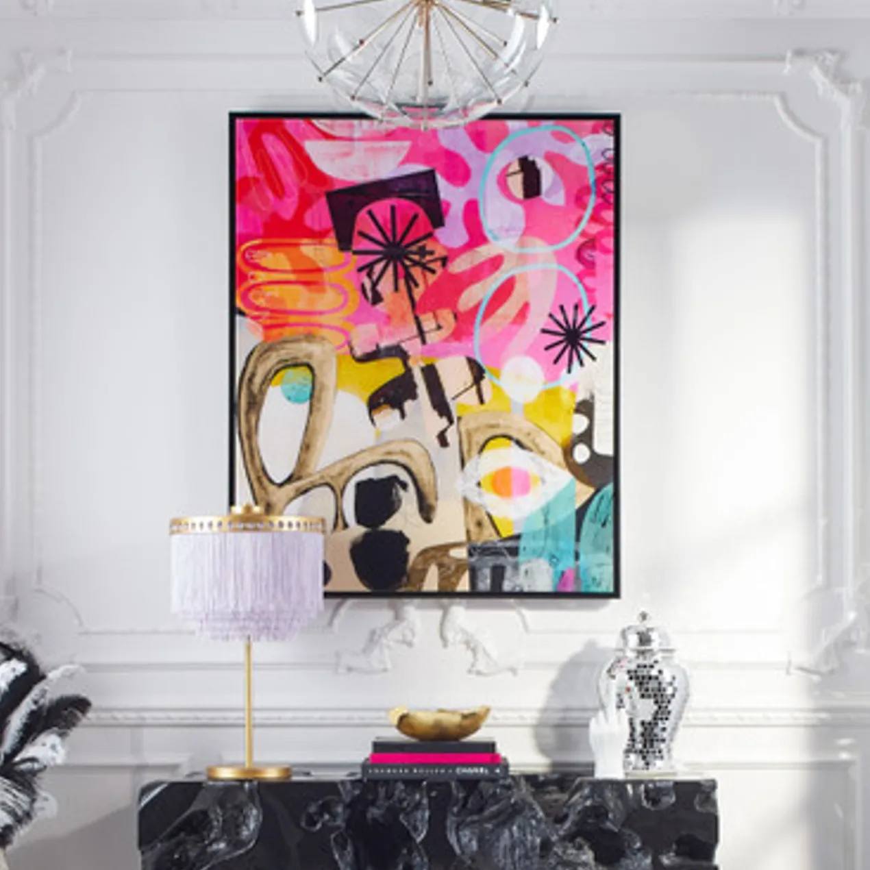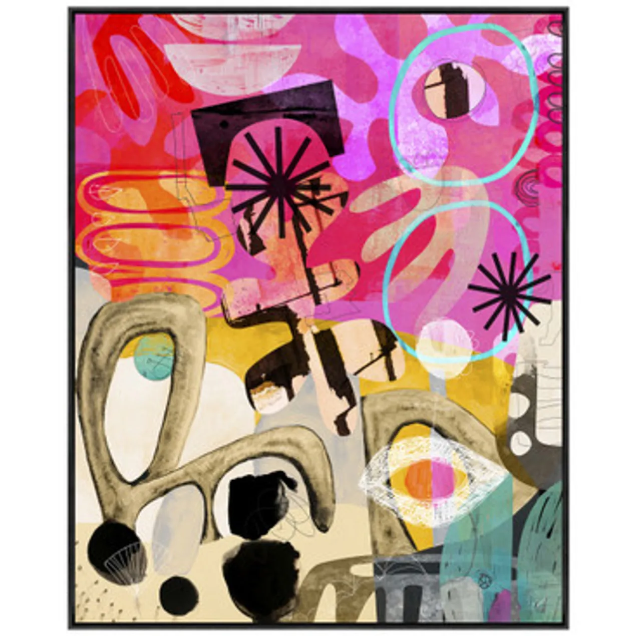 Printed on canvas with a glossy finish and set in a black frame, this striking work from Nikki Chu lends a modern mood and vibrant color to the wall.
