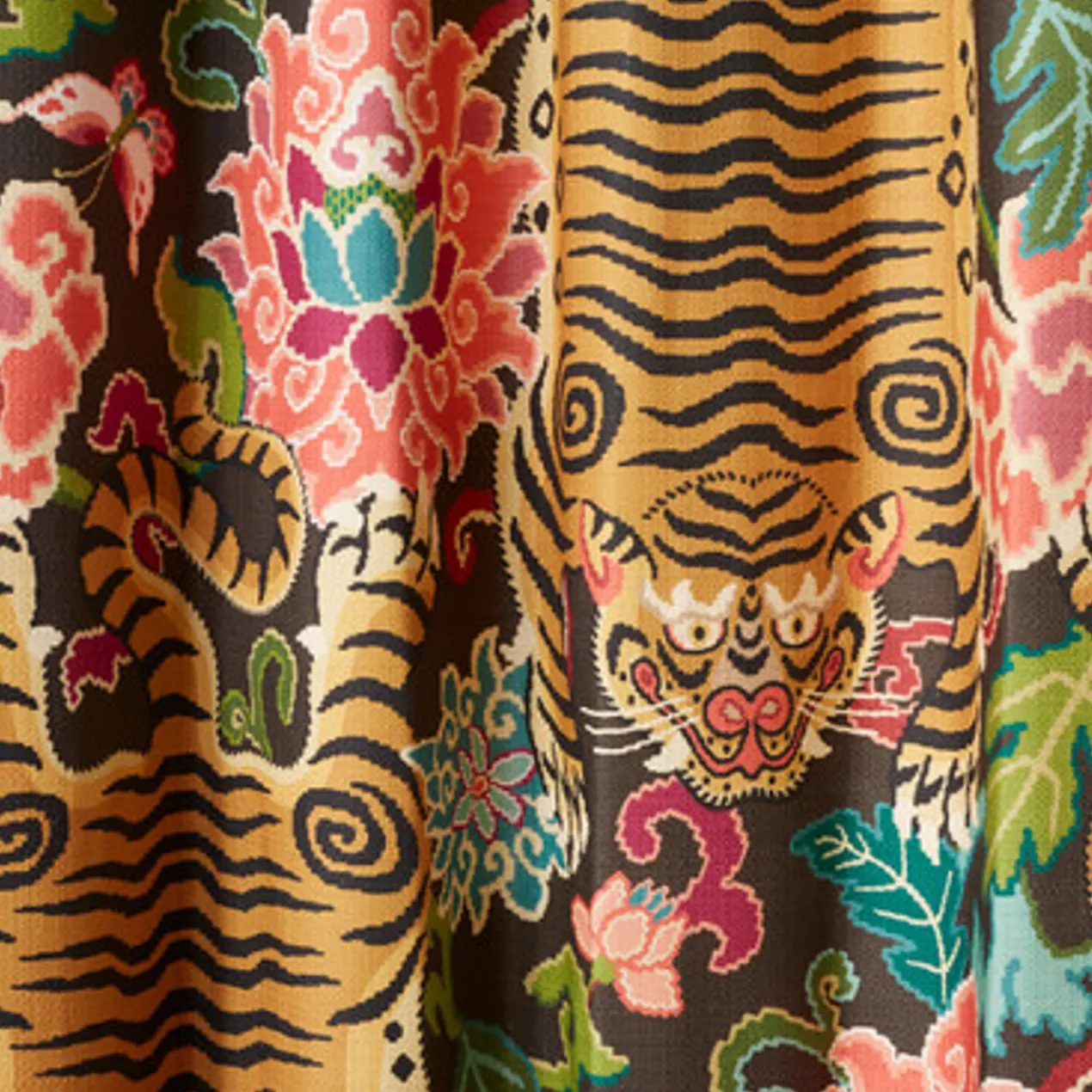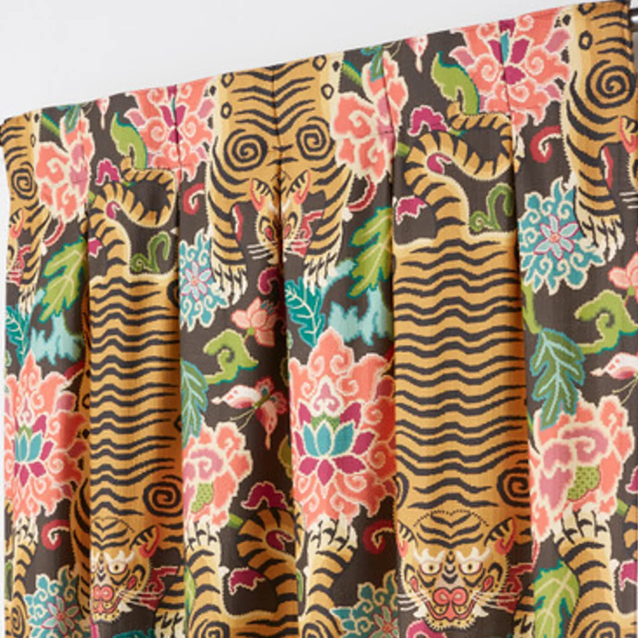 Crafted of cotton with a lively tiger print, our Nimer Panel enriches any interior with bold pattern and a touch of whimsy. Customizable to fit your space, it’s offered in four lengths (84”, 96”, 108”, or 120”), two header styles (rod pocket or inverted pleat), and two colorways (gold or grey). Panel includes lining. Sold as a single panel.