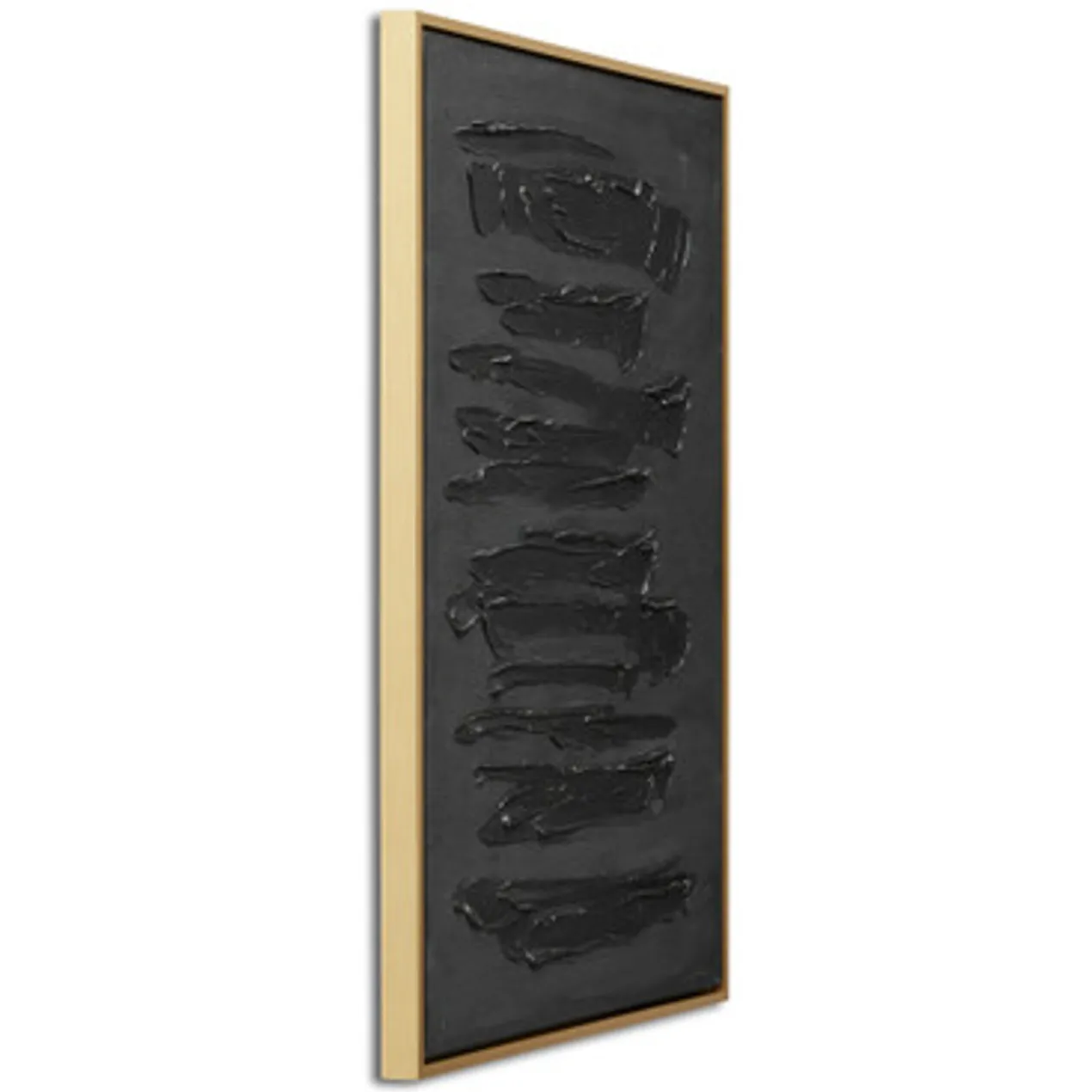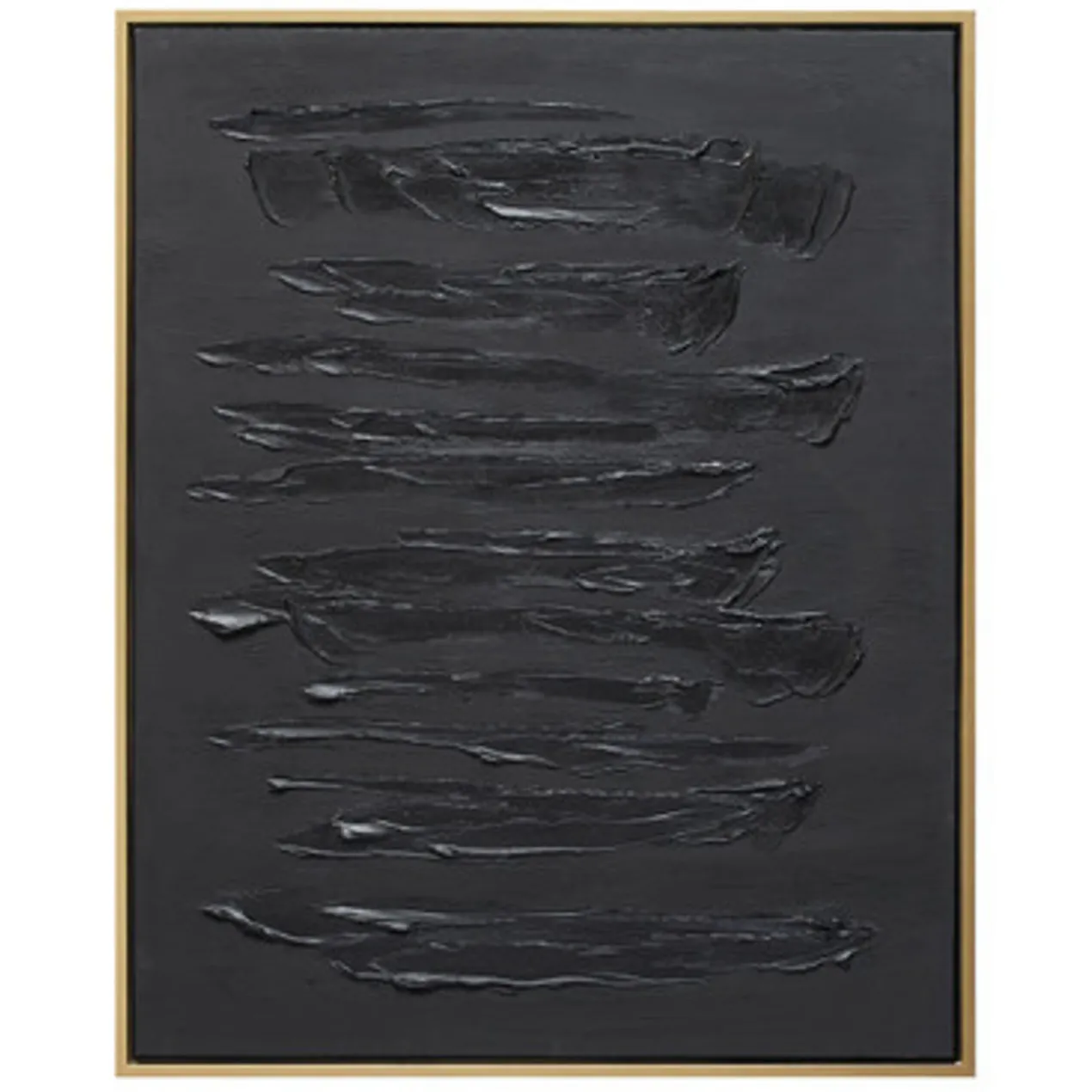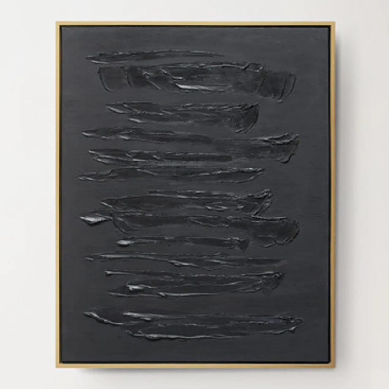 Bold brushstrokes in a moody, dark palette add an incredible element of texture and drama to this abstraction. Painted on canvas, this piece is displayed in a gold floater frame.