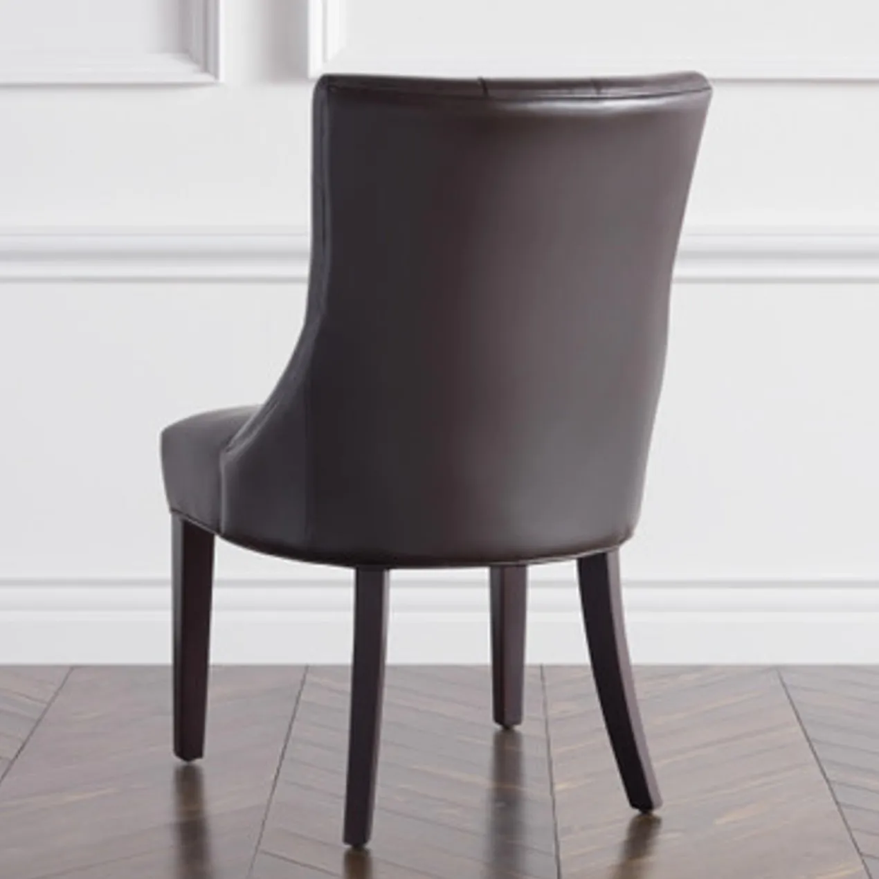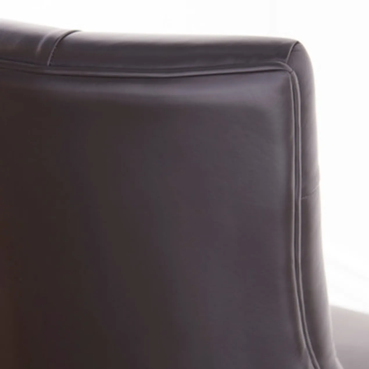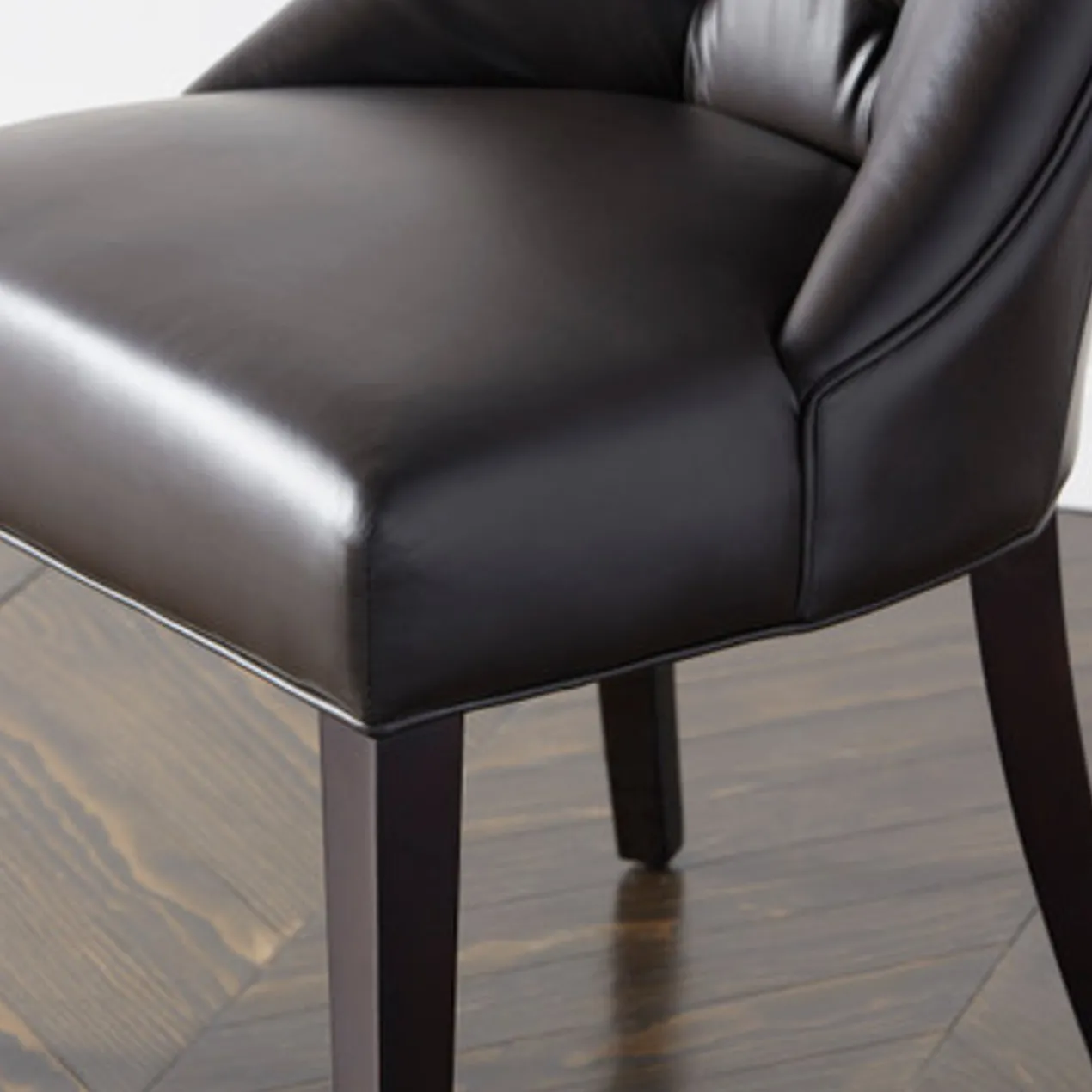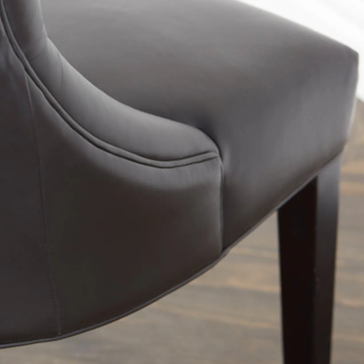A relaxed pitch and low, sheltering arms give this chair an understated elegance, and comfort that encourages leisurely dining. Shown in Cortina Leather Dark Brown.