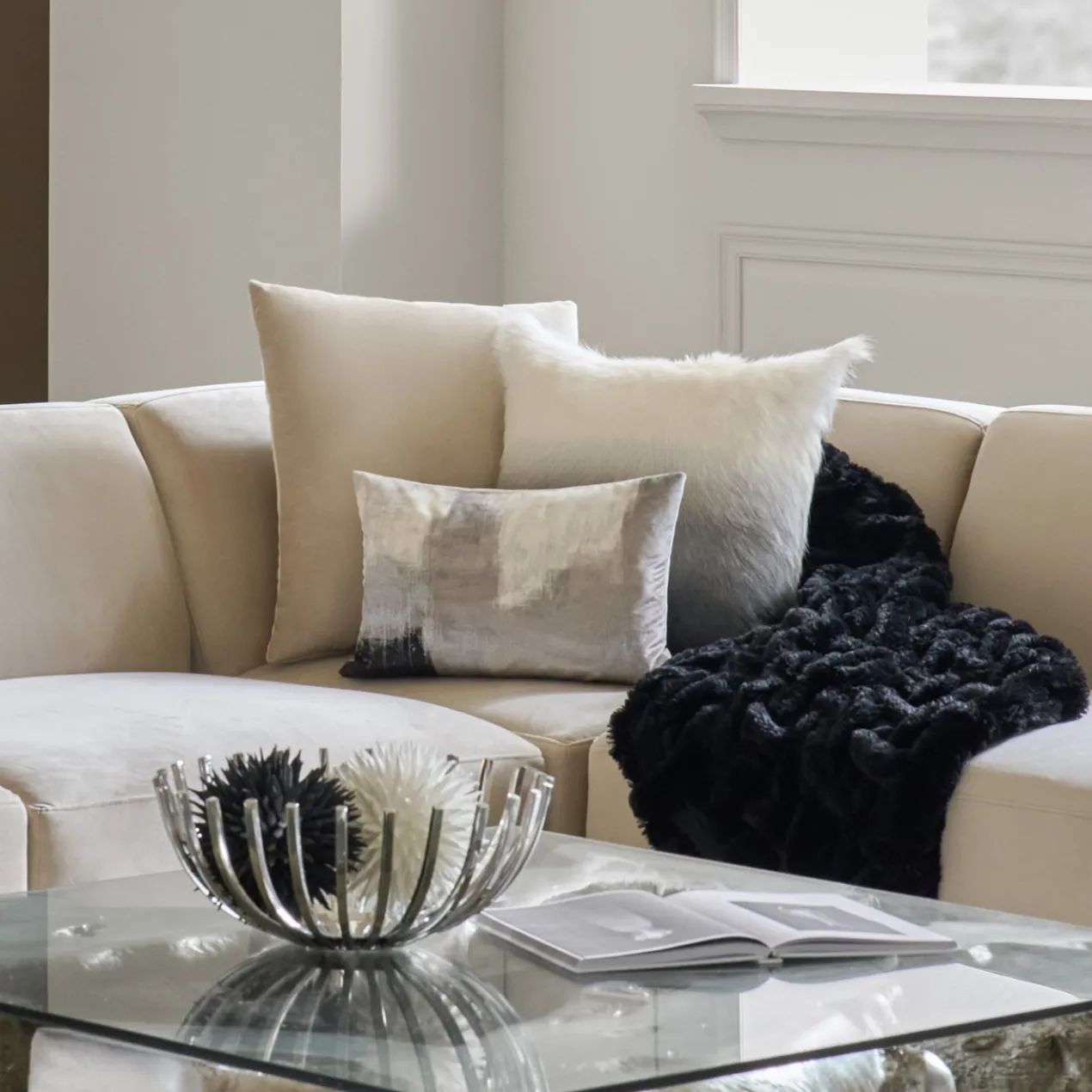 A stylish accent for any sofa or bed, The Nya Lumbar pillow is made from soft printed velvet in black and grey with metallic silver embroidery accents. Removable cover with hidden zipper closure. Plush feather down Insert included.