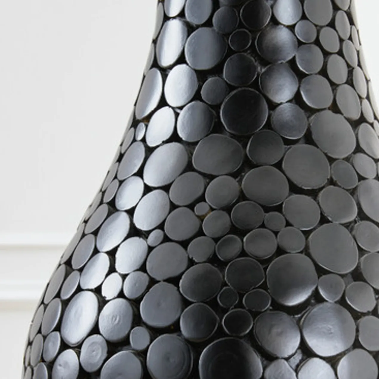 We’ve combined clean, contemporary design with the organic sensibility of natural materials to create our exclusive Black Oslo Vase. The simple shape of the large vase is crafted in a base of fiberglass, with a hand-applied overlay of intricately arranged flat coin-shaped pieces of wood. A smart glossy Black finish accents the modern appeal.