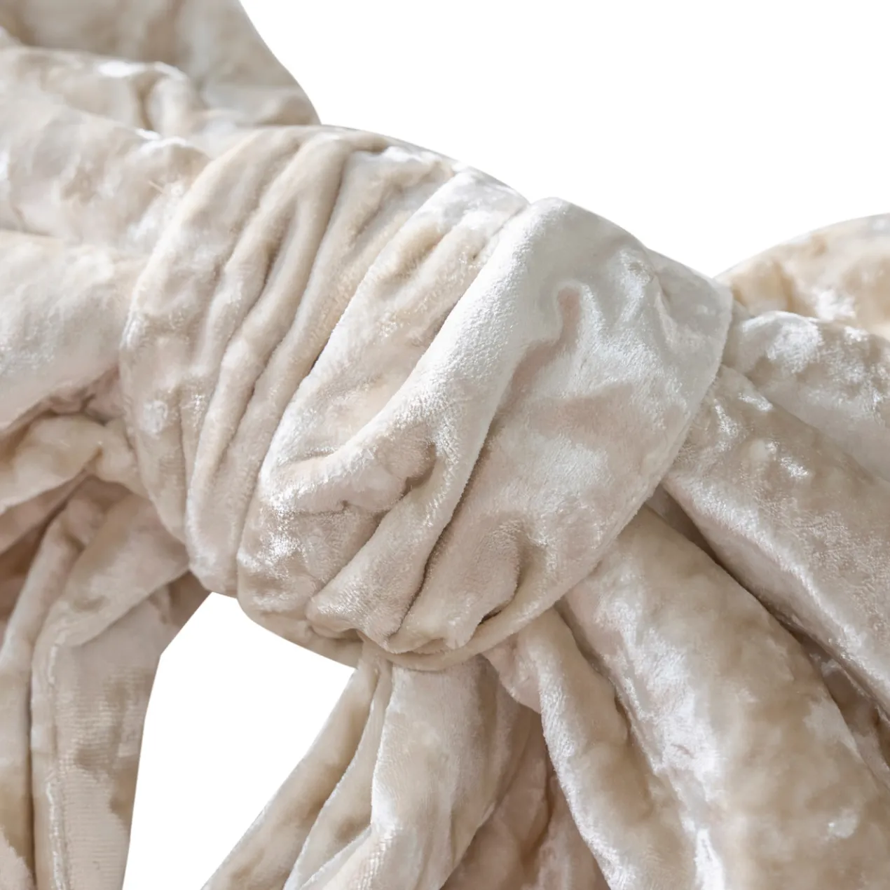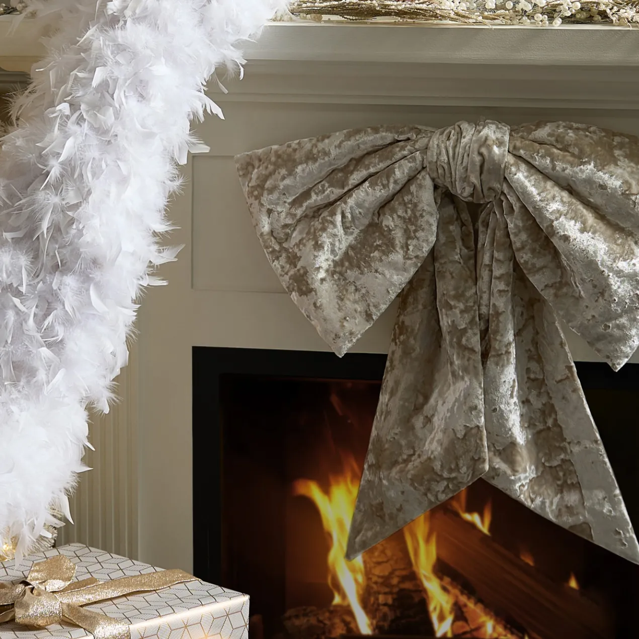 Elevate your holiday décor with our Large Crushed Velvet Bow, the ultimate statement piece for festive elegance. Crafted from lustrous crushed velvet, this bow exudes a soft, sophisticated charm that effortlessly enhances any holiday setting. The back has both a loop and ties so it can be styled on a mantel, over a doorway, or even on a tree top.