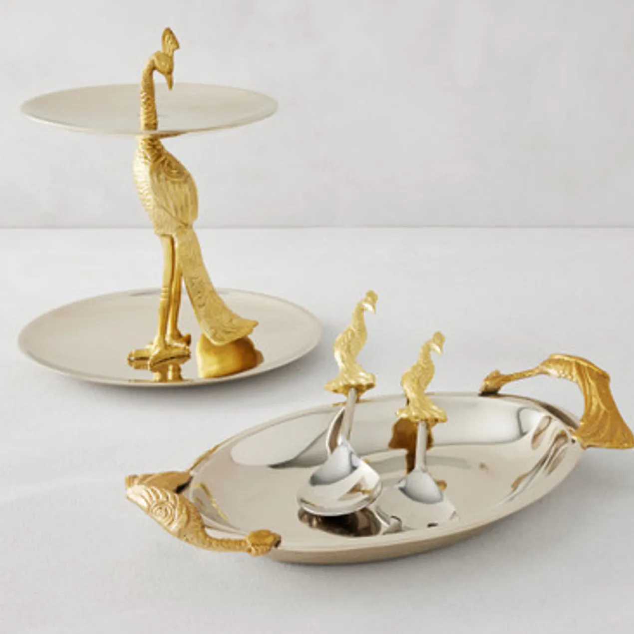 A stylish addition to the vanity, bar, or coffee table. This tray is crafted of stainless-steel with a gleaming silver finish, and stunning peacock handles in a contrasting gold.