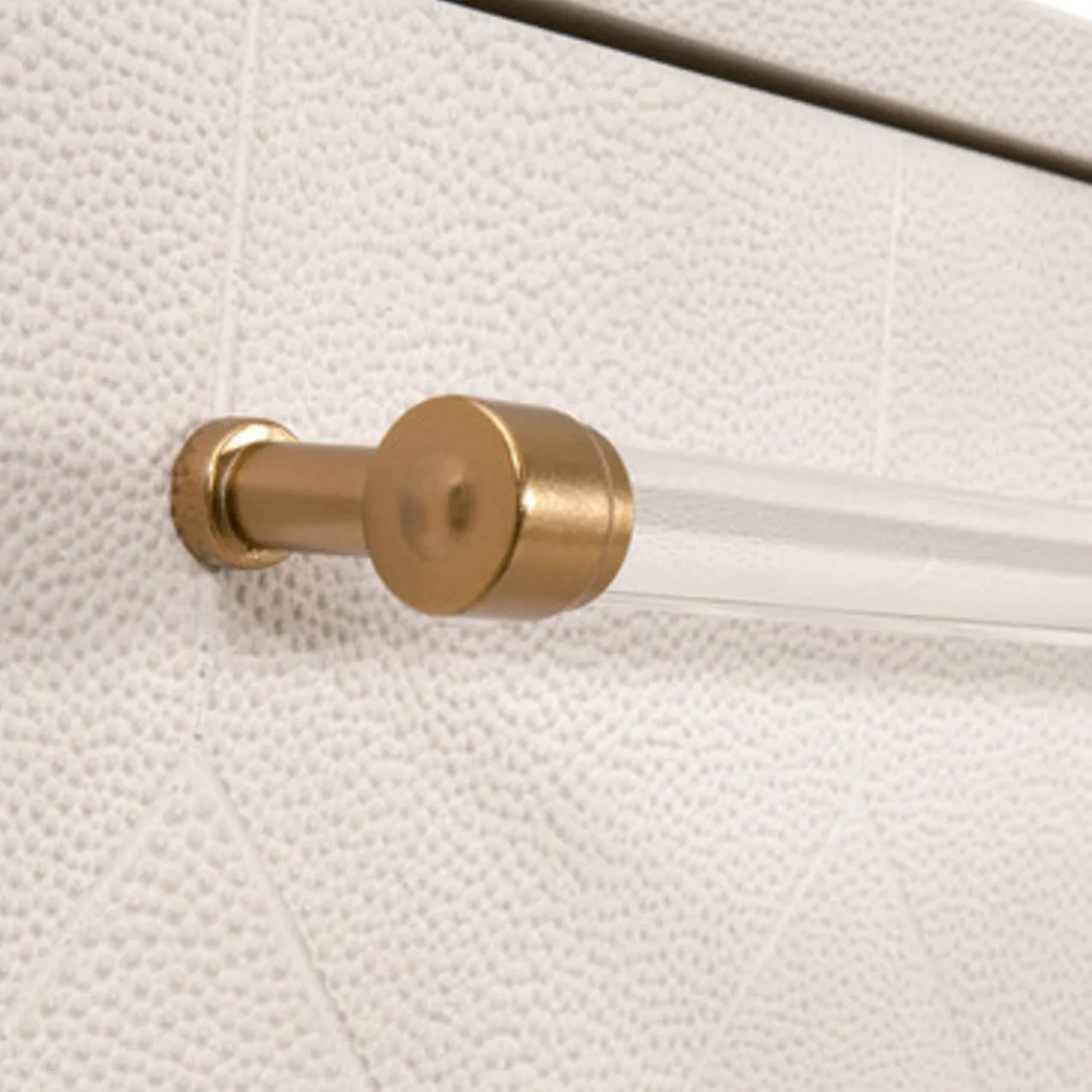 Perfect for a light and airy aesthetic, with a white faux shagreen finish, acrylic side panels and brushed brass accents. Effortlessly store items or media components inside with its removable and adjustable shelves and cord management holes.