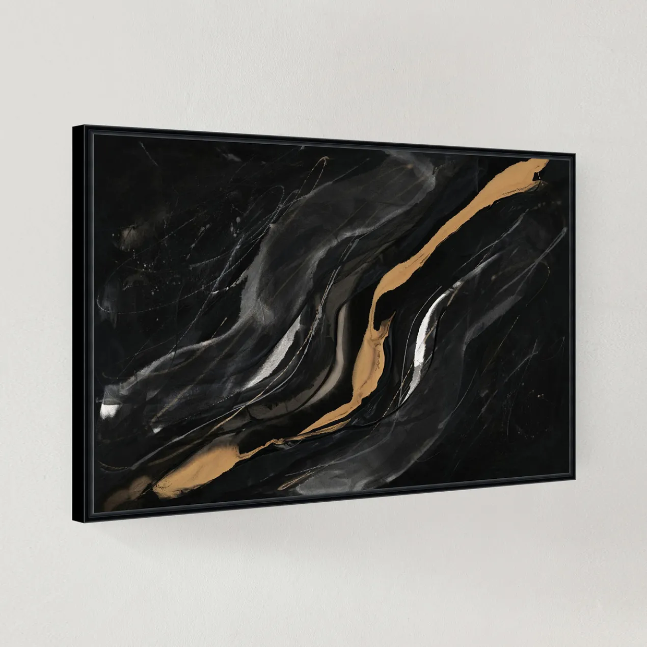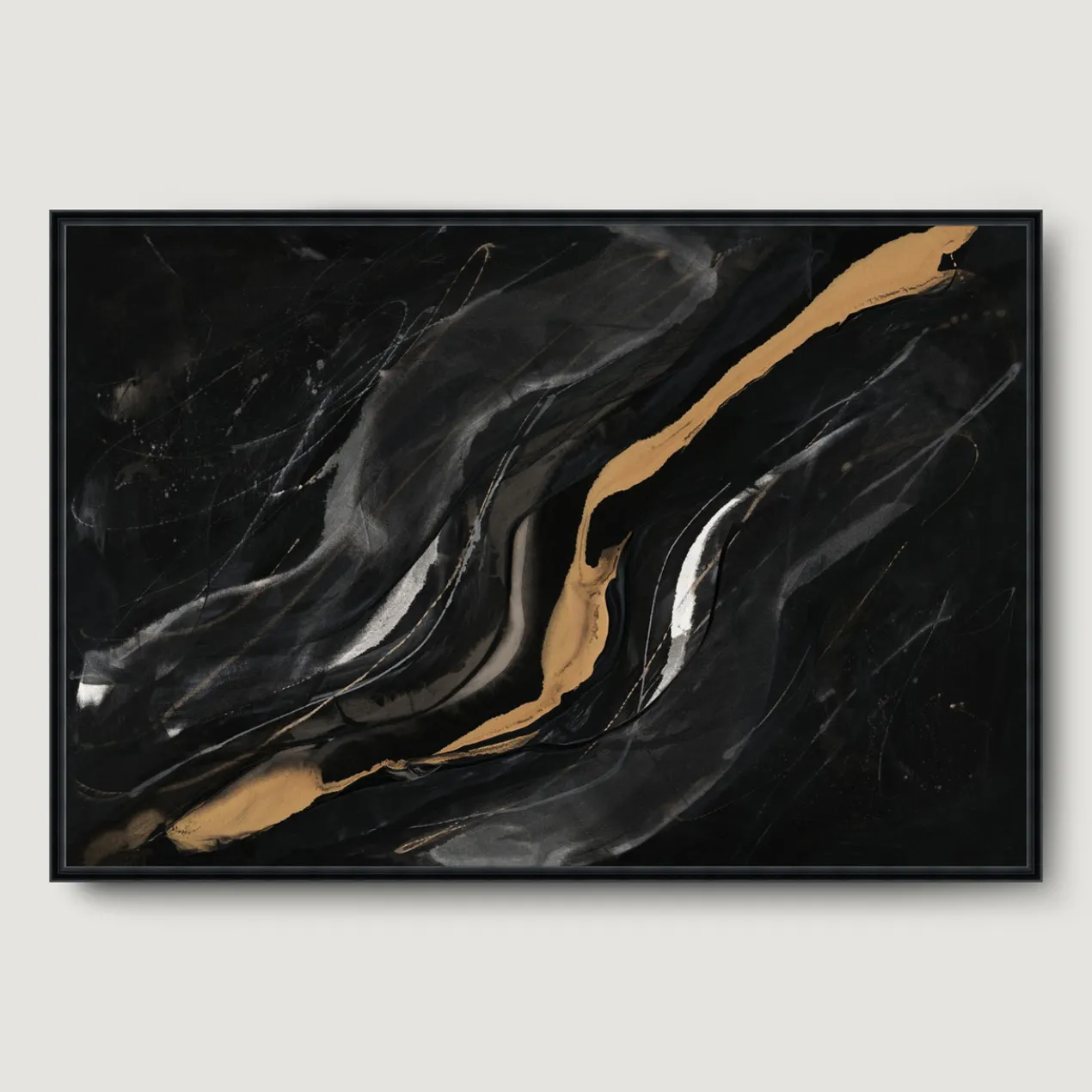 - Set in a black floater frame.